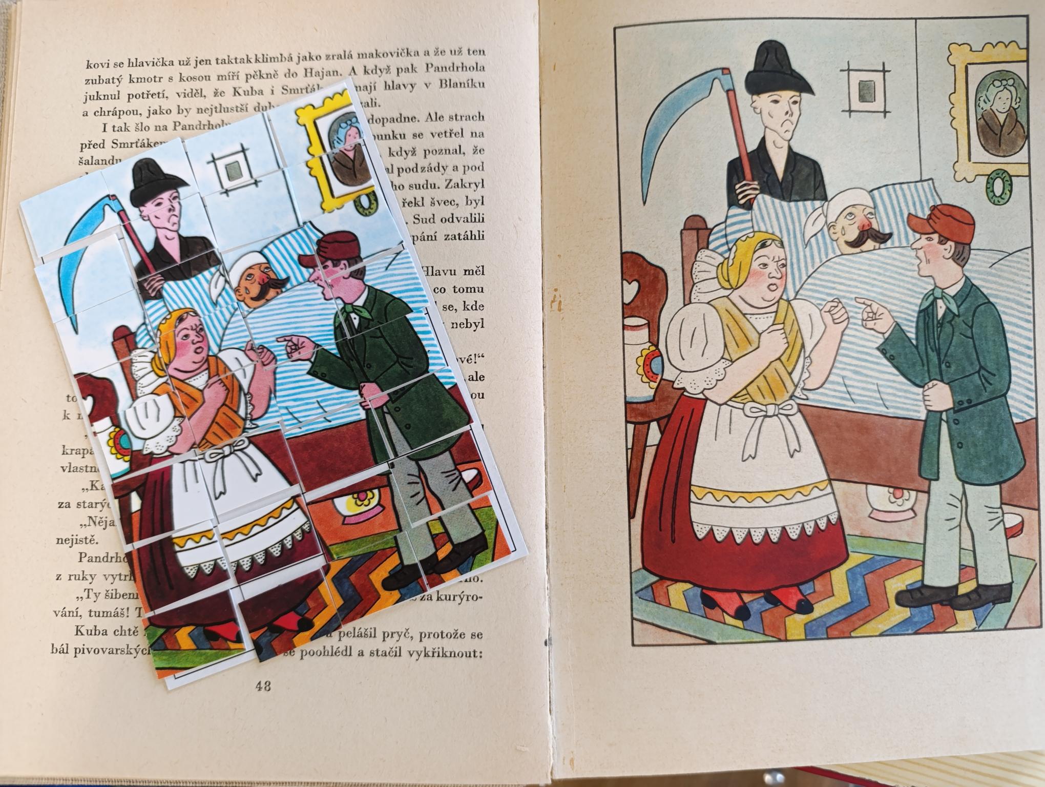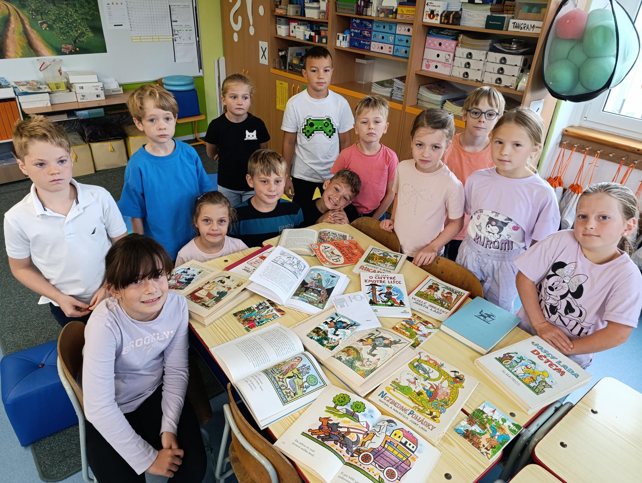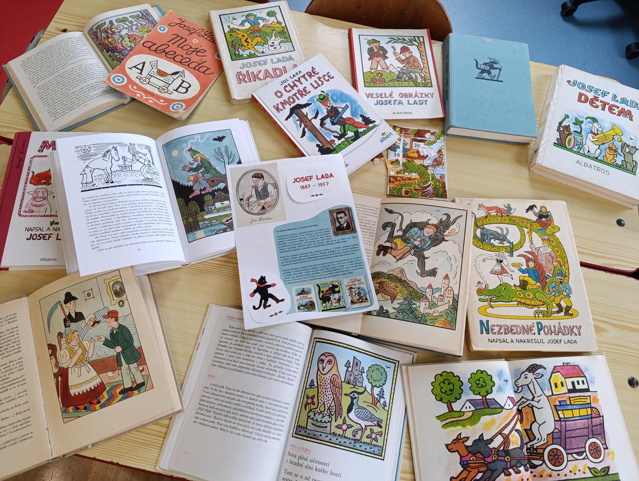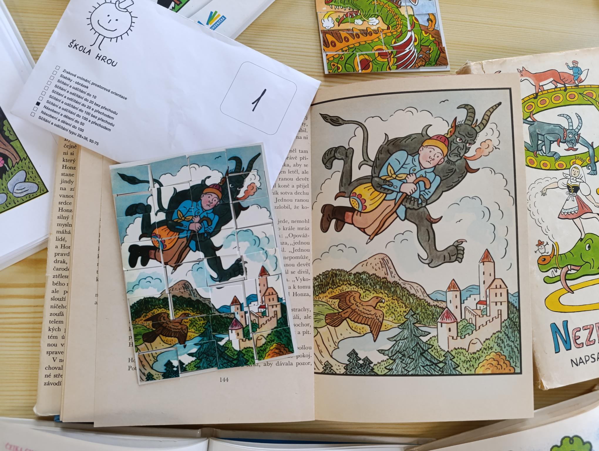 Násobilku si procvičujeme i skládáním puzzlí. Díky obrázkům se seznamujeme s obrázky pohádek Josefa Lady. Ve třídě jsme si udělali i ukázku jeho knih.