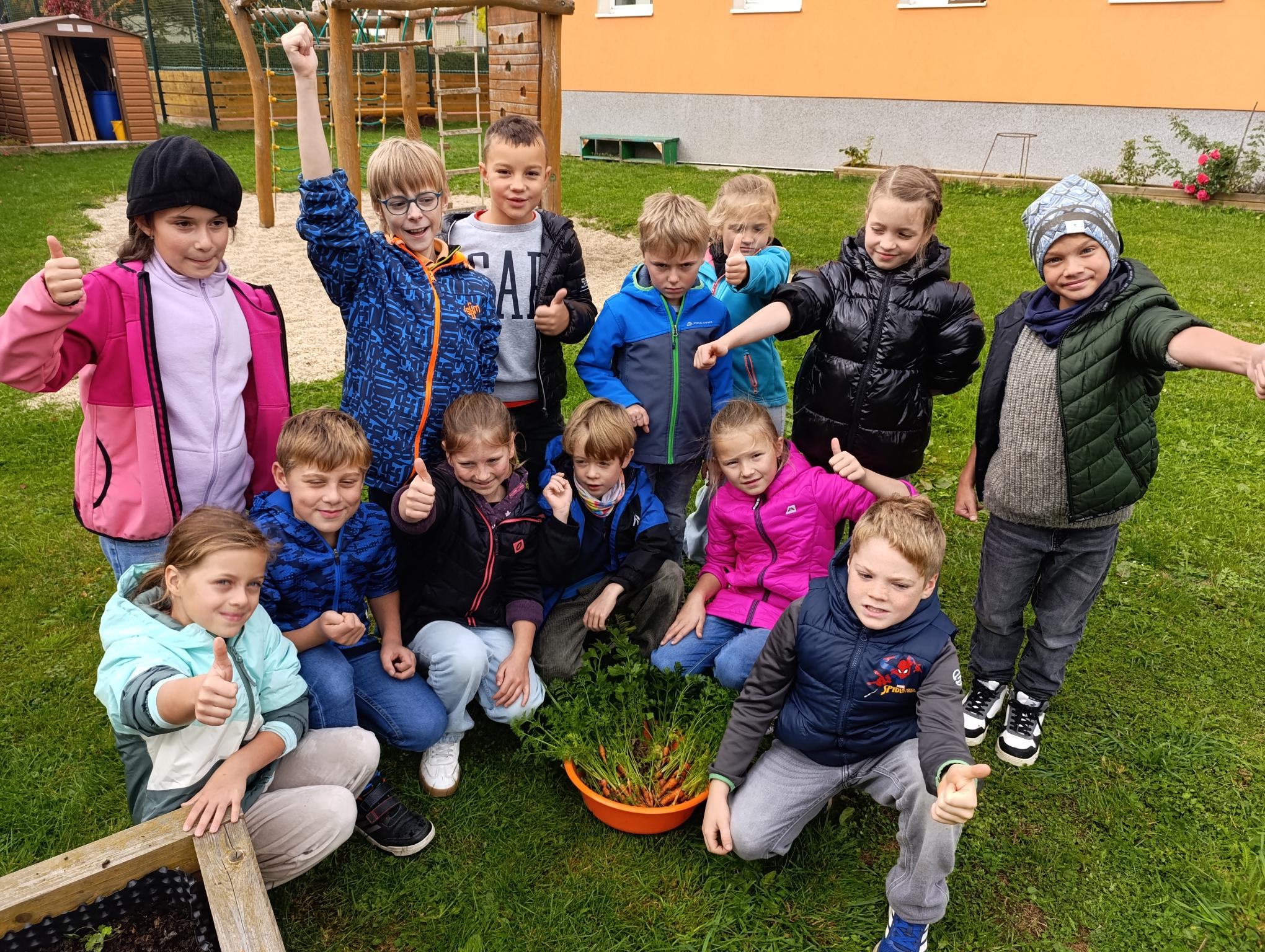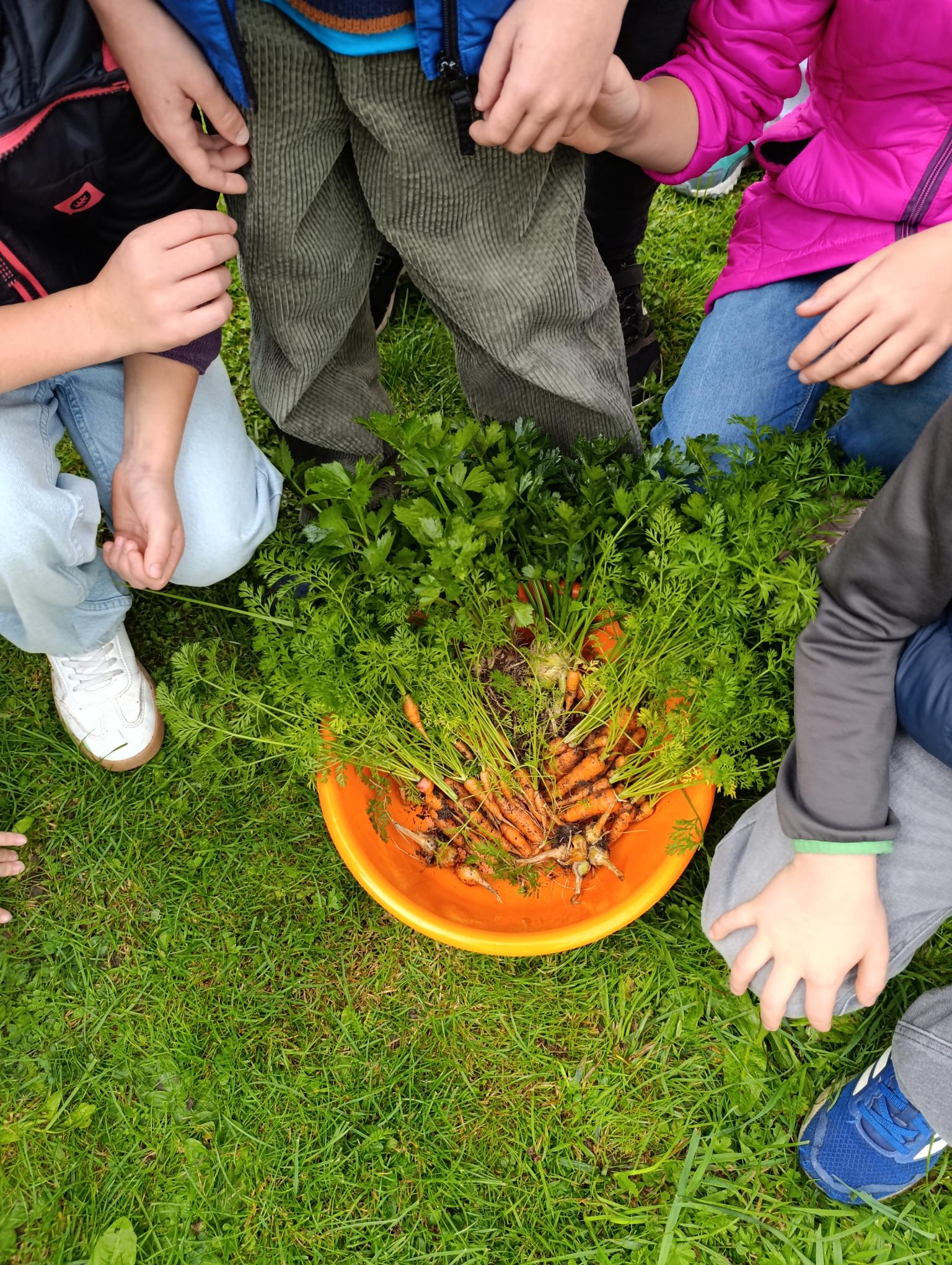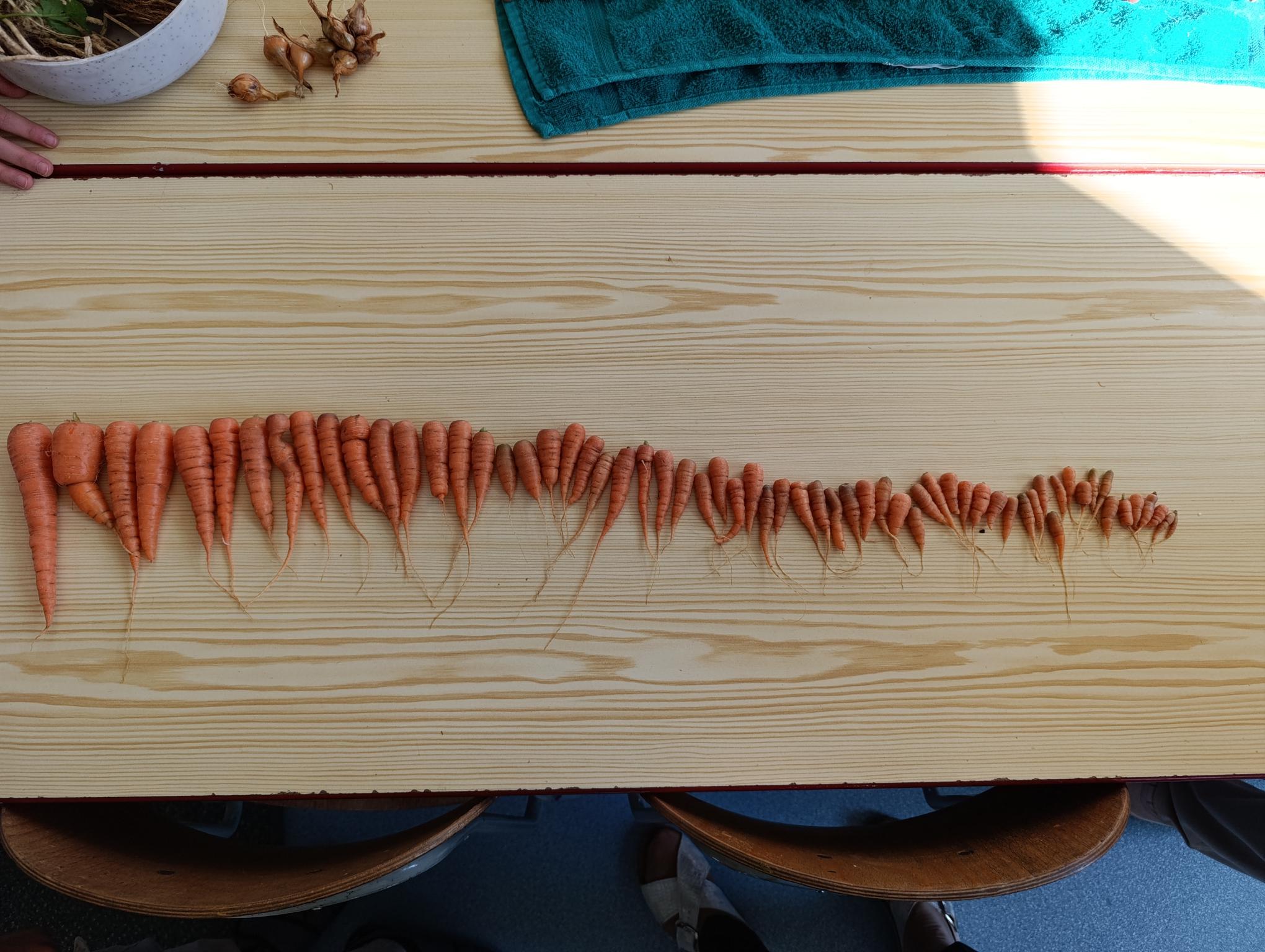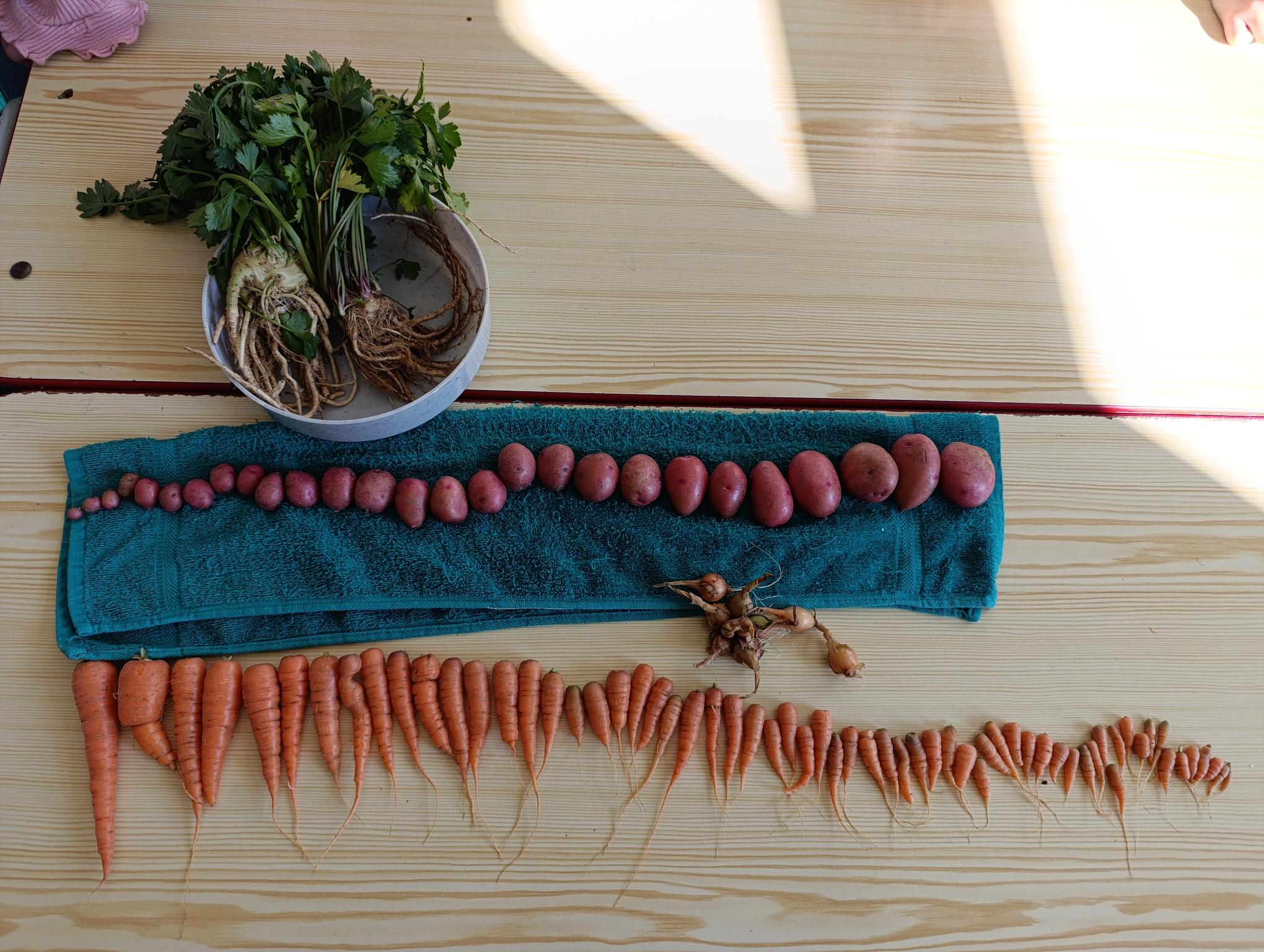 Sklidili jsme si naši úrodu - mrkvičky, cibulku a celer. Ze třech brambor jsme vypěstovali 27 bramborů.