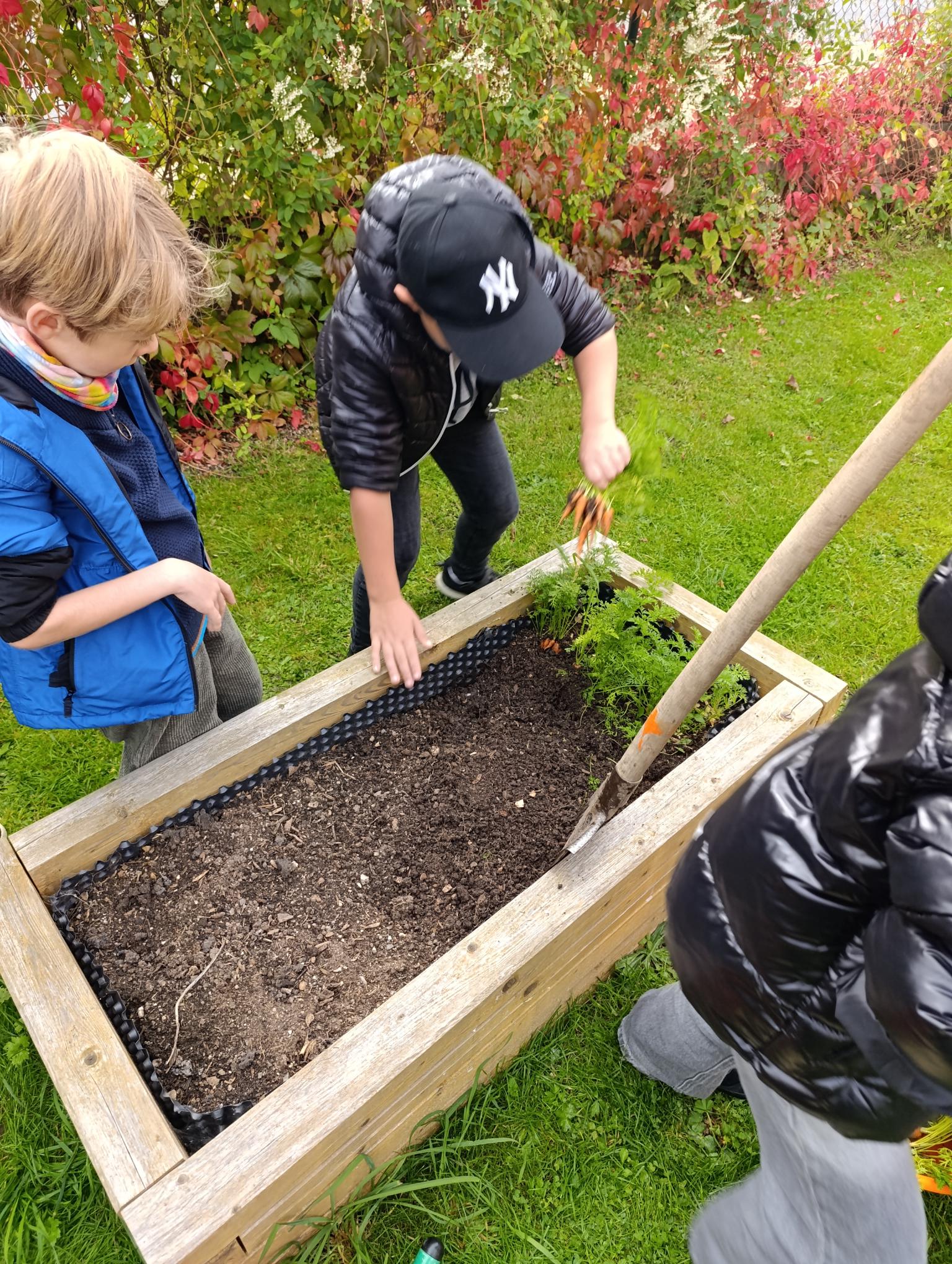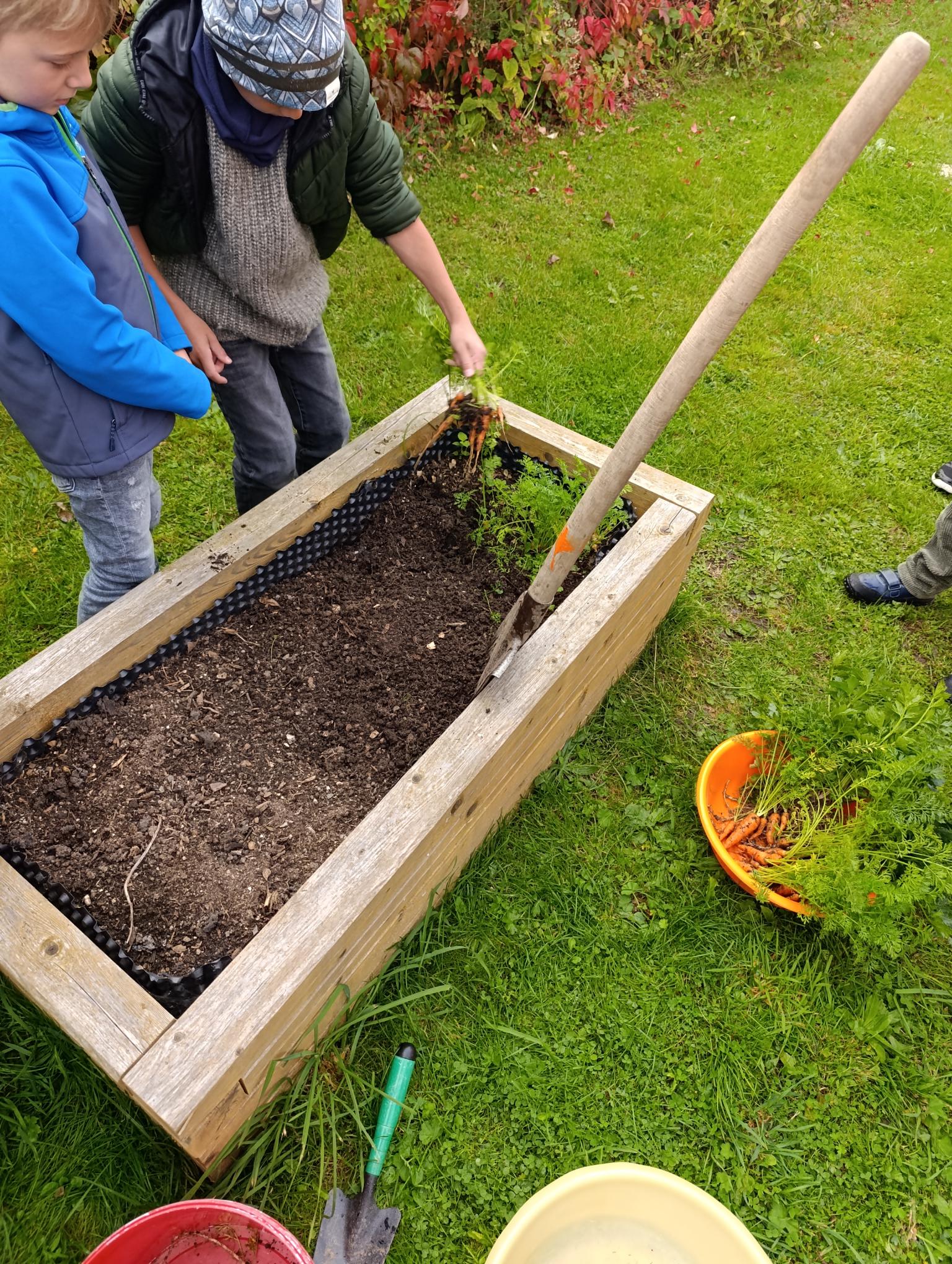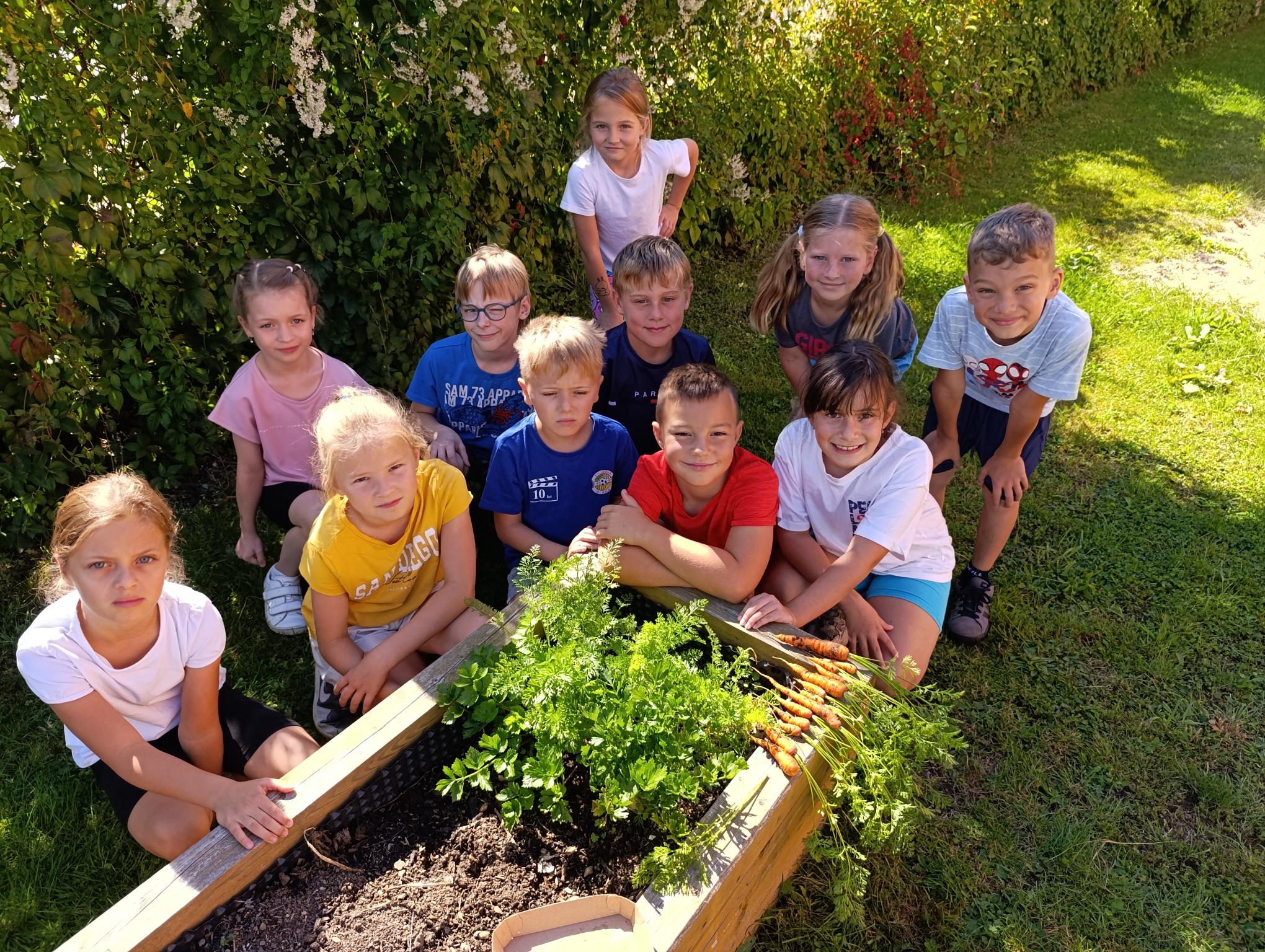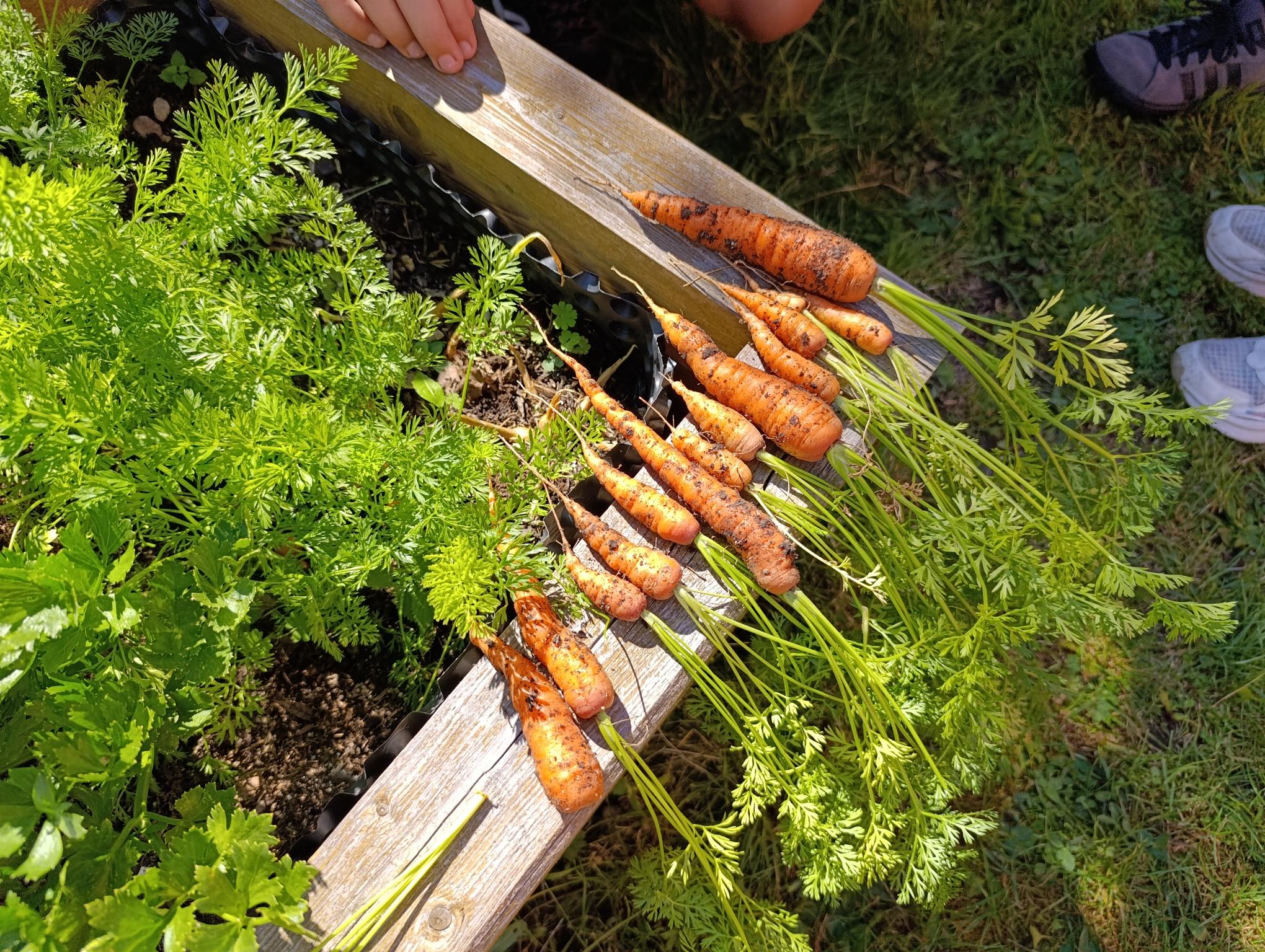 Sklidili jsme si naši úrodu - mrkvičky, cibulku a celer. Ze třech brambor jsme vypěstovali 27 bramborů.