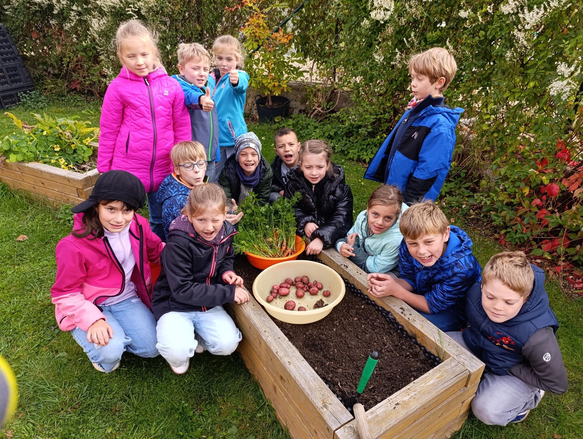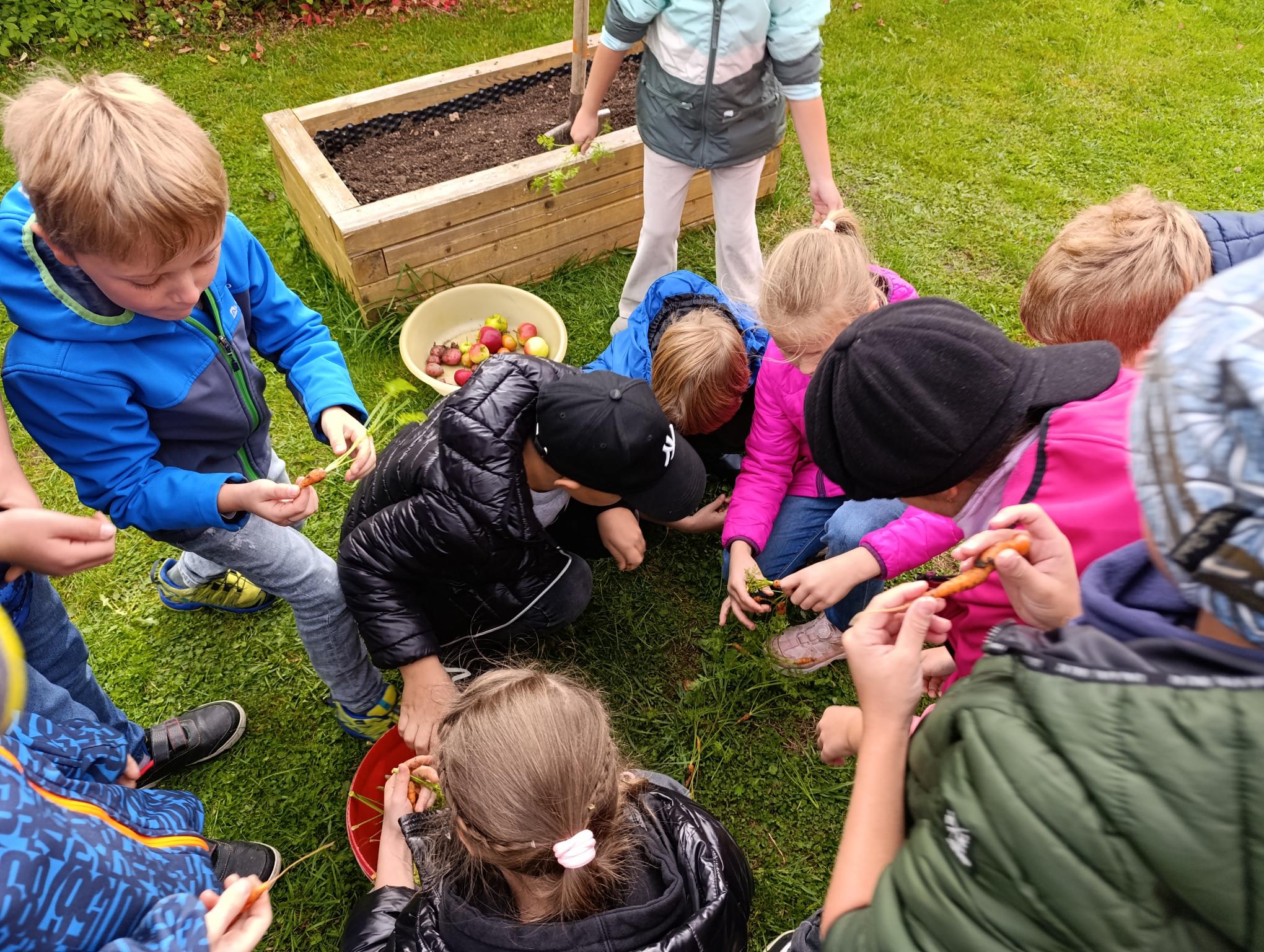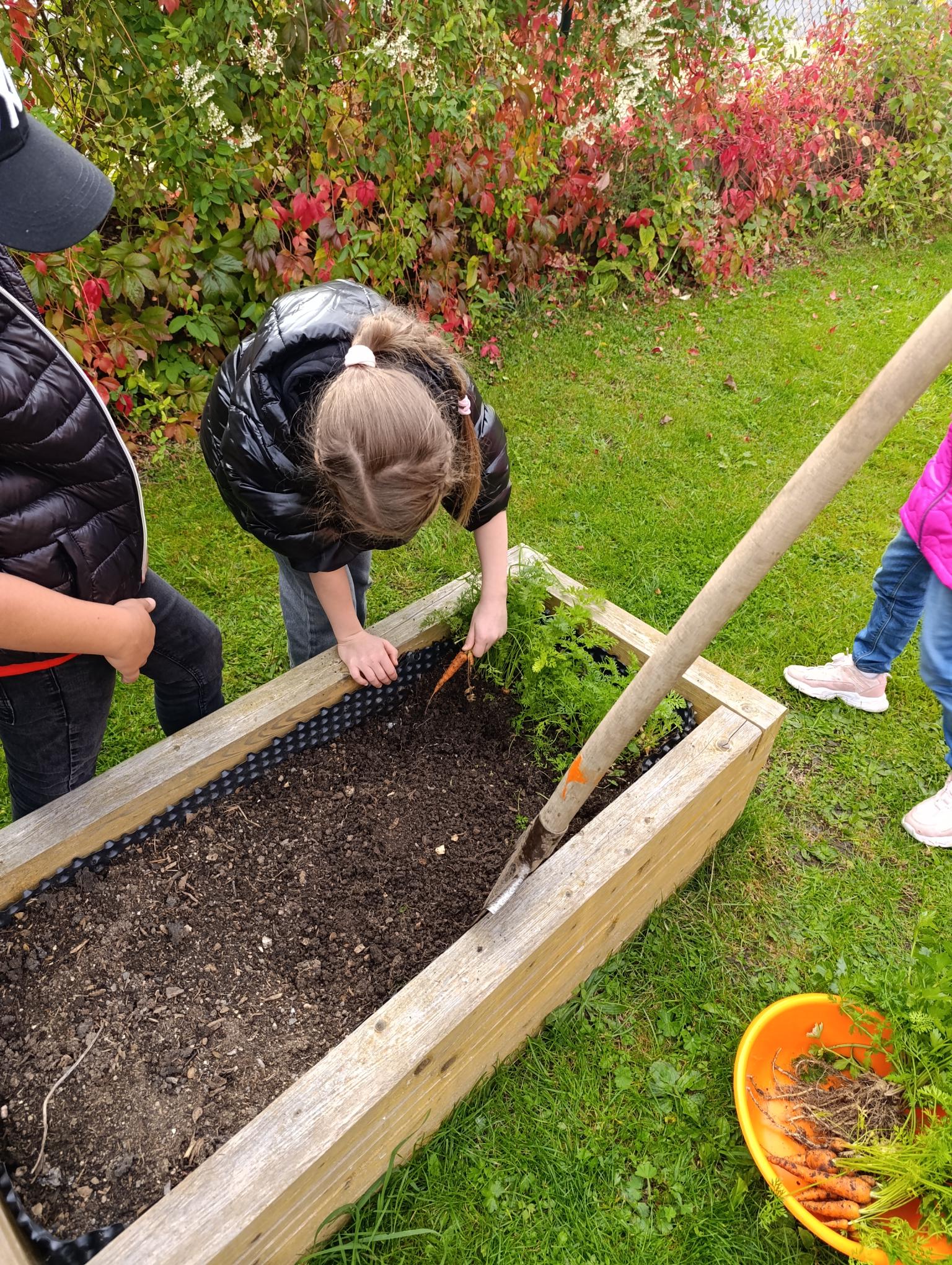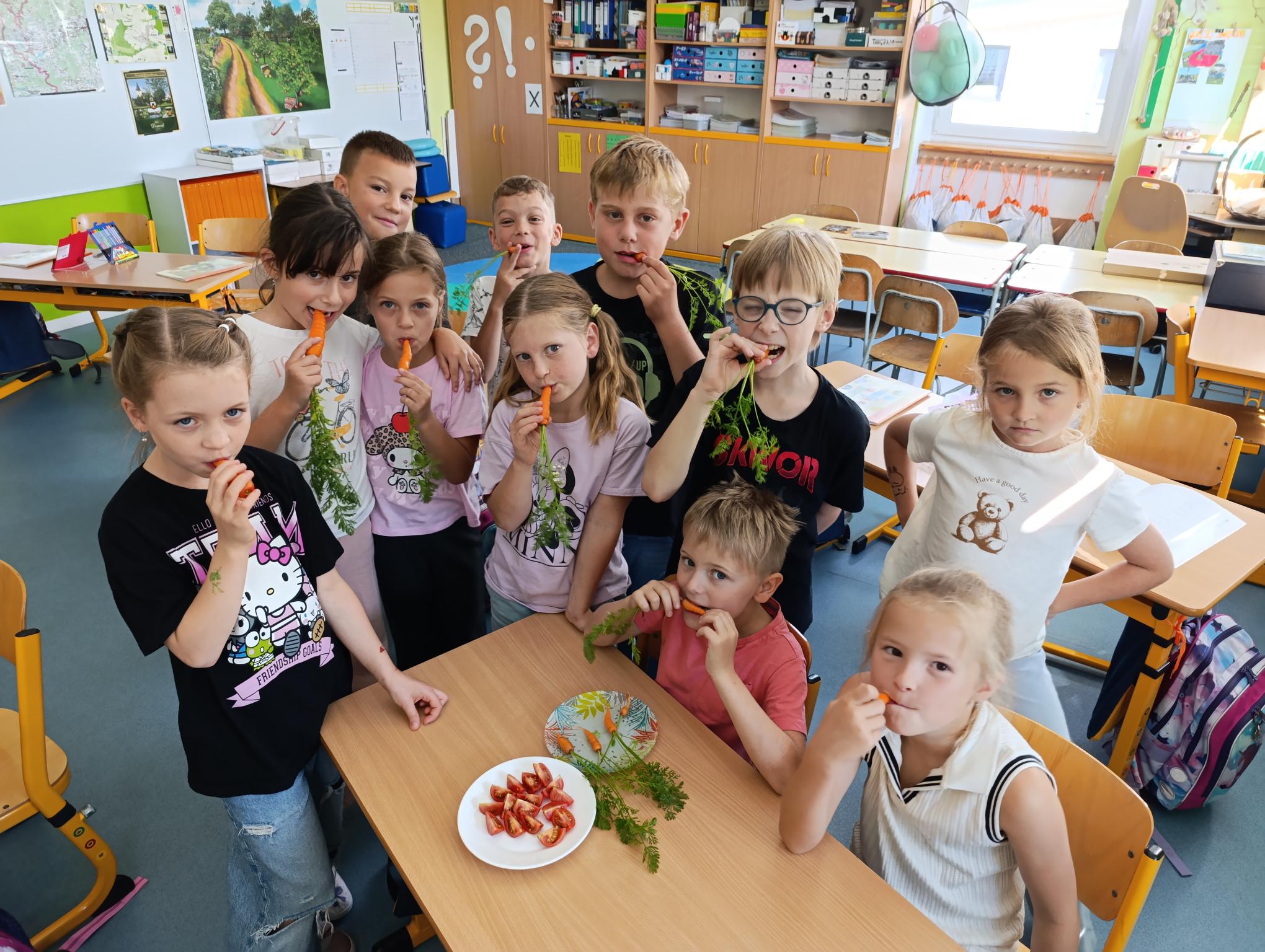 Sklidili jsme si naši úrodu - mrkvičky, cibulku a celer. Ze třech brambor jsme vypěstovali 27 bramborů.