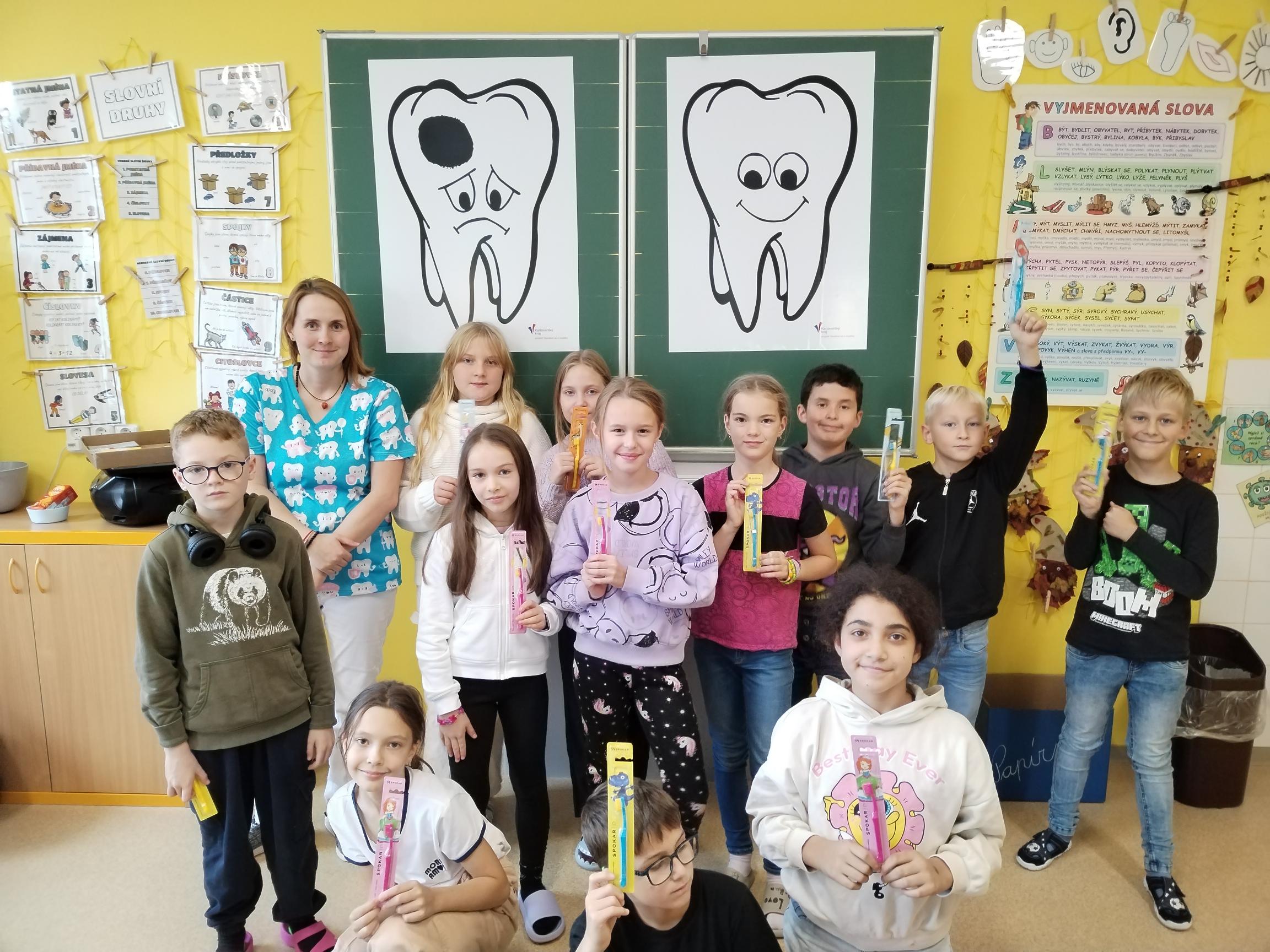 V pátek 24. 10. jsme zahájili program "Staráme se o zoubky." Dentální hygienistka dětem ukázala, jak si správně čistit zuby. Společně přiřazovali kartičky potravin podle toho, zda jsou a nebo nejsou vhodné pro naše zuby. Jako dárek dostalo každé dítě kartáček na zuby. Další hodina nás čeká v prosinci.