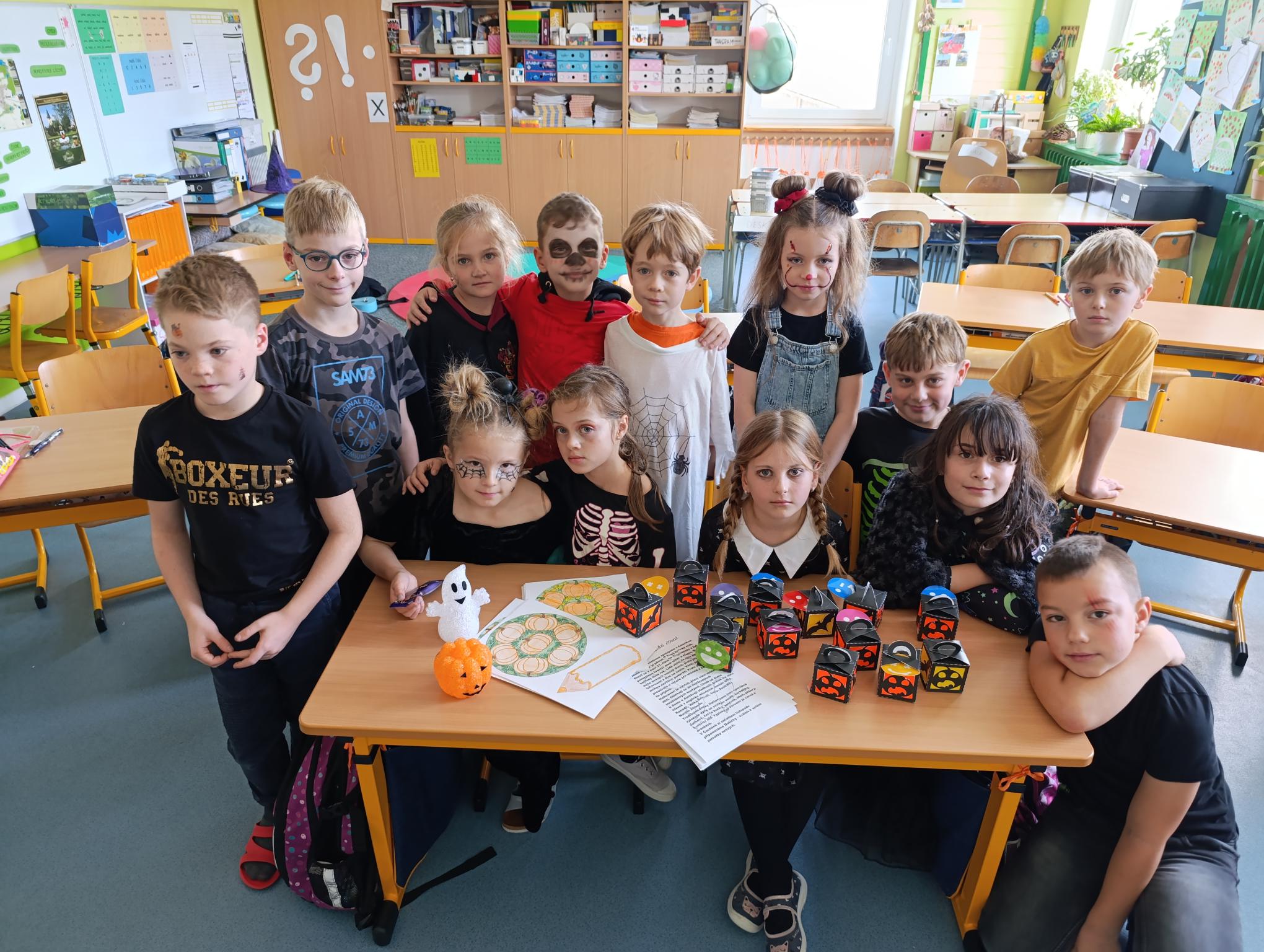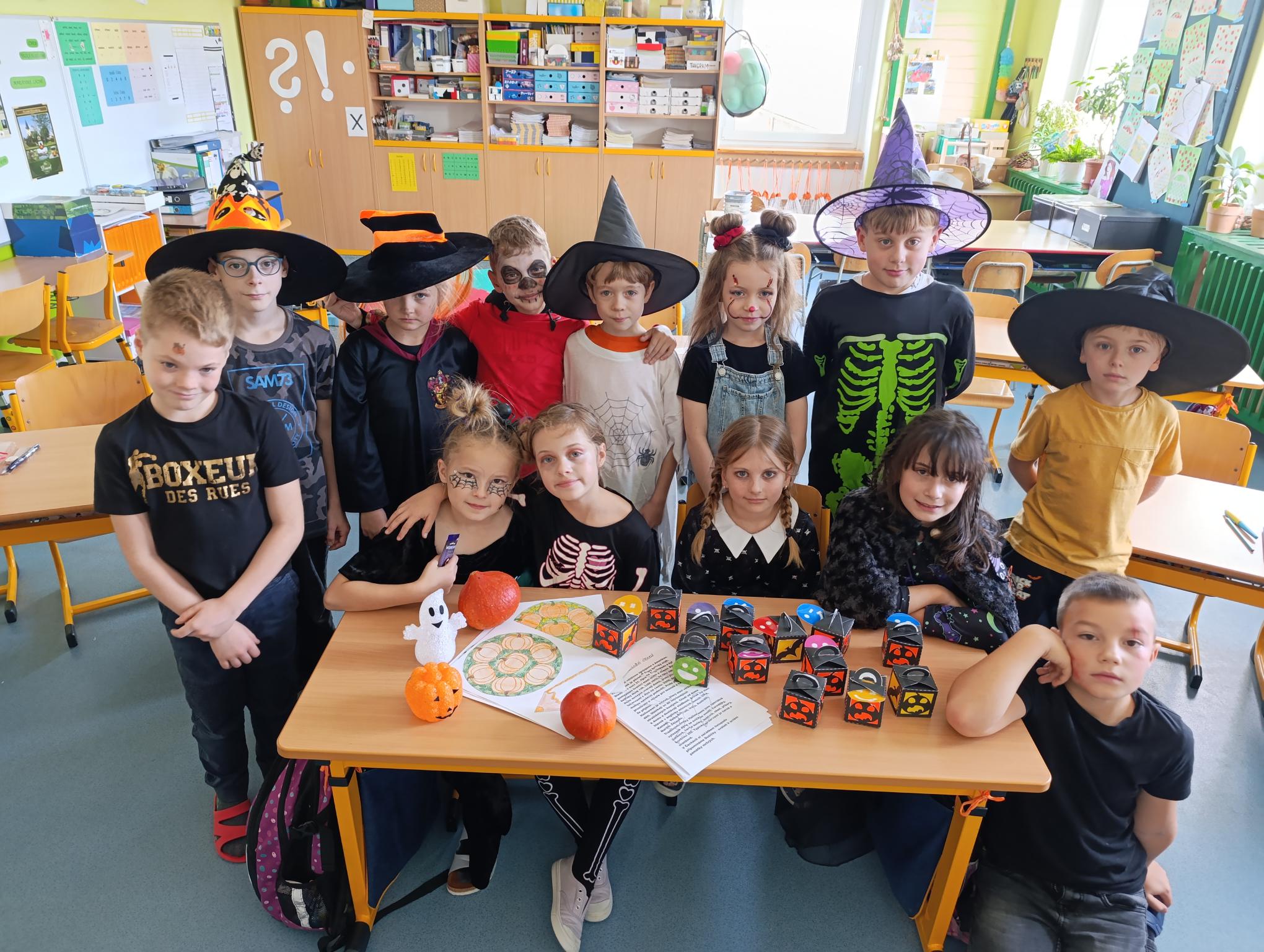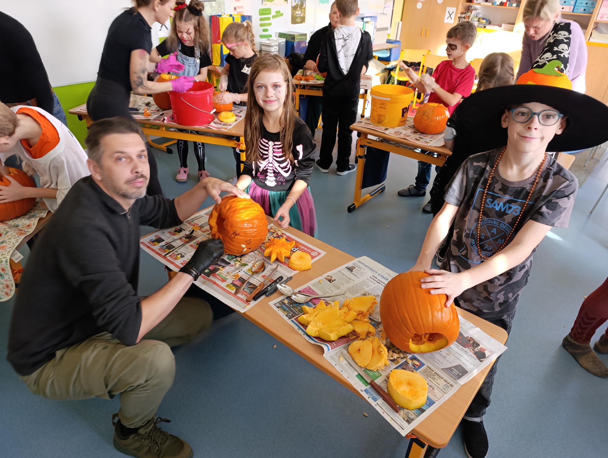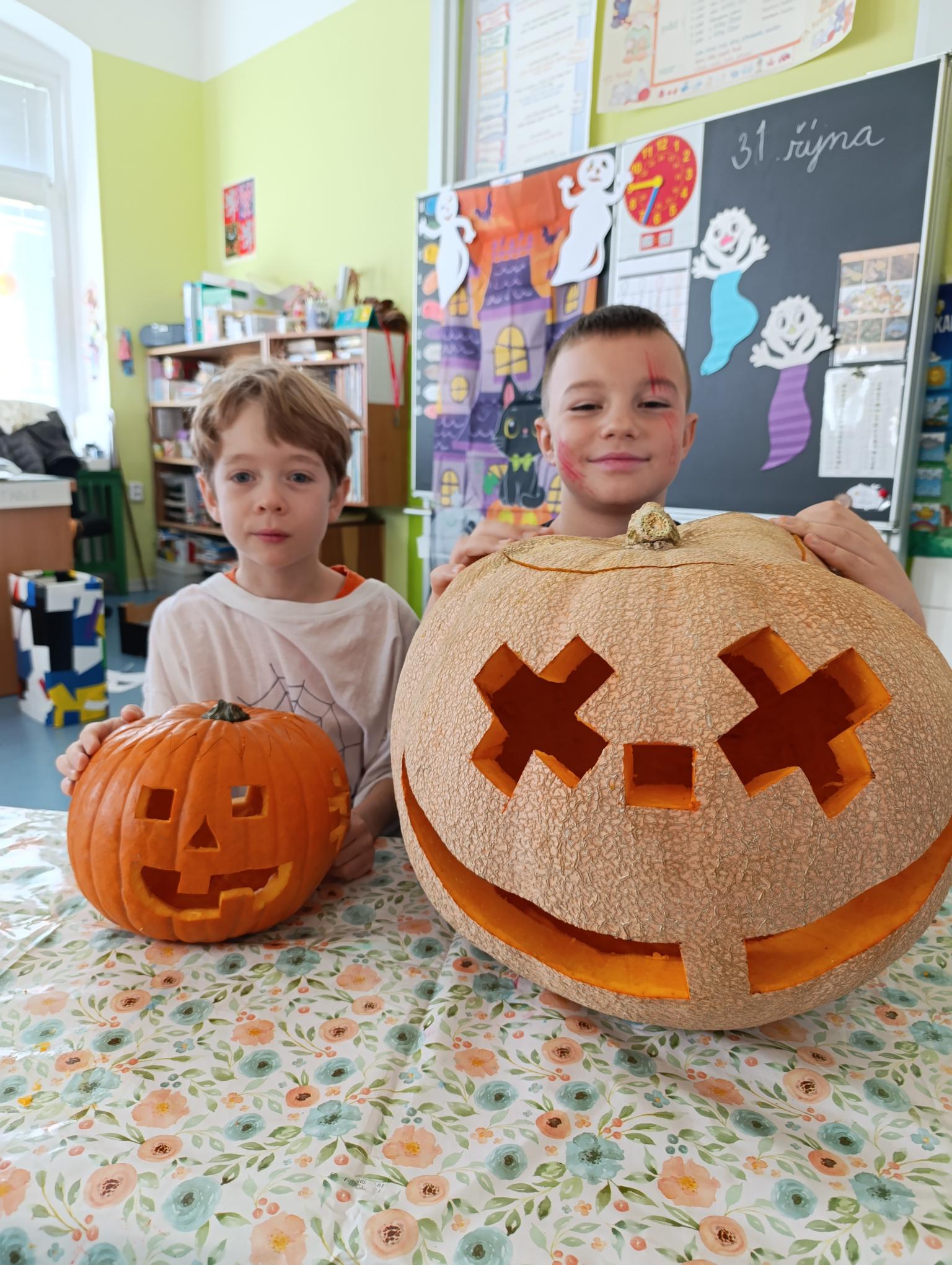 Tematický den DUCHAŘENÍ jsme zahájili rytmickou show v sále KD. Zatančili jsme si, soutěžíli, motali mumie. Ve třídě jsme se potom s pomocí rodičů pustili do dlabání a vyrobili jsme dýňové lampy. Opět se nám moc povedly. Po práci odměna - užili jsme si malou hostinu: muffiny, halloweenské cukroví a pizzy, jablečné trhance a jablíčka z naší zahrady. Děkujeme maminkám!!! Pak jsme si dokončili malé papírové lampičky, do kterých jsme si schovali drobné sladkosti, opět dárek jedné z maminek. Abychom se dozvěděli historii svátku Halloween, připravili jsme si zašifrovaný text a hledali jsme odpovědi na otázky. Pomocí počítání jsme vyluštili jména rodiny Bubáčkových. Nakonec jsme si připomněli český svátek Dušičky