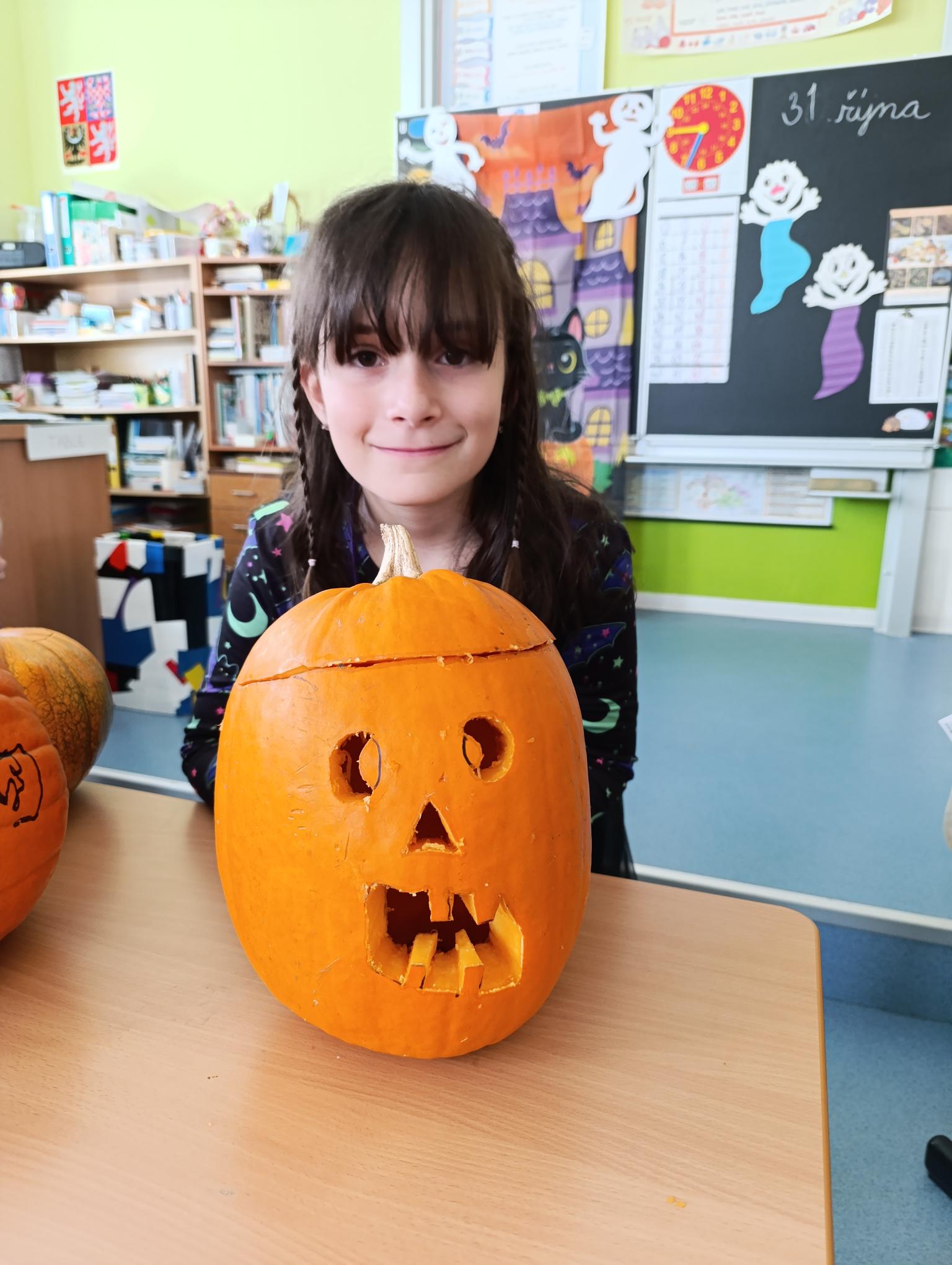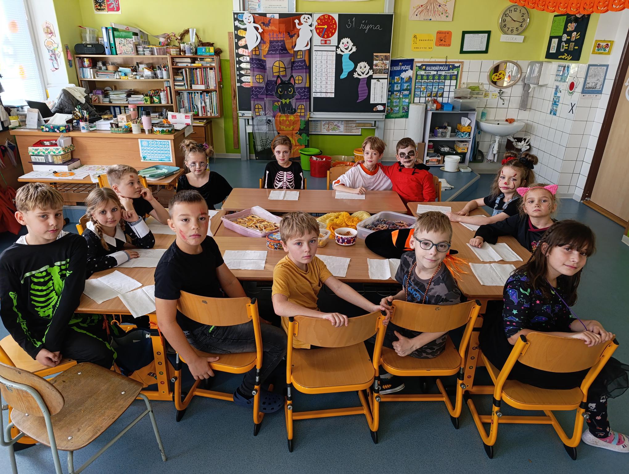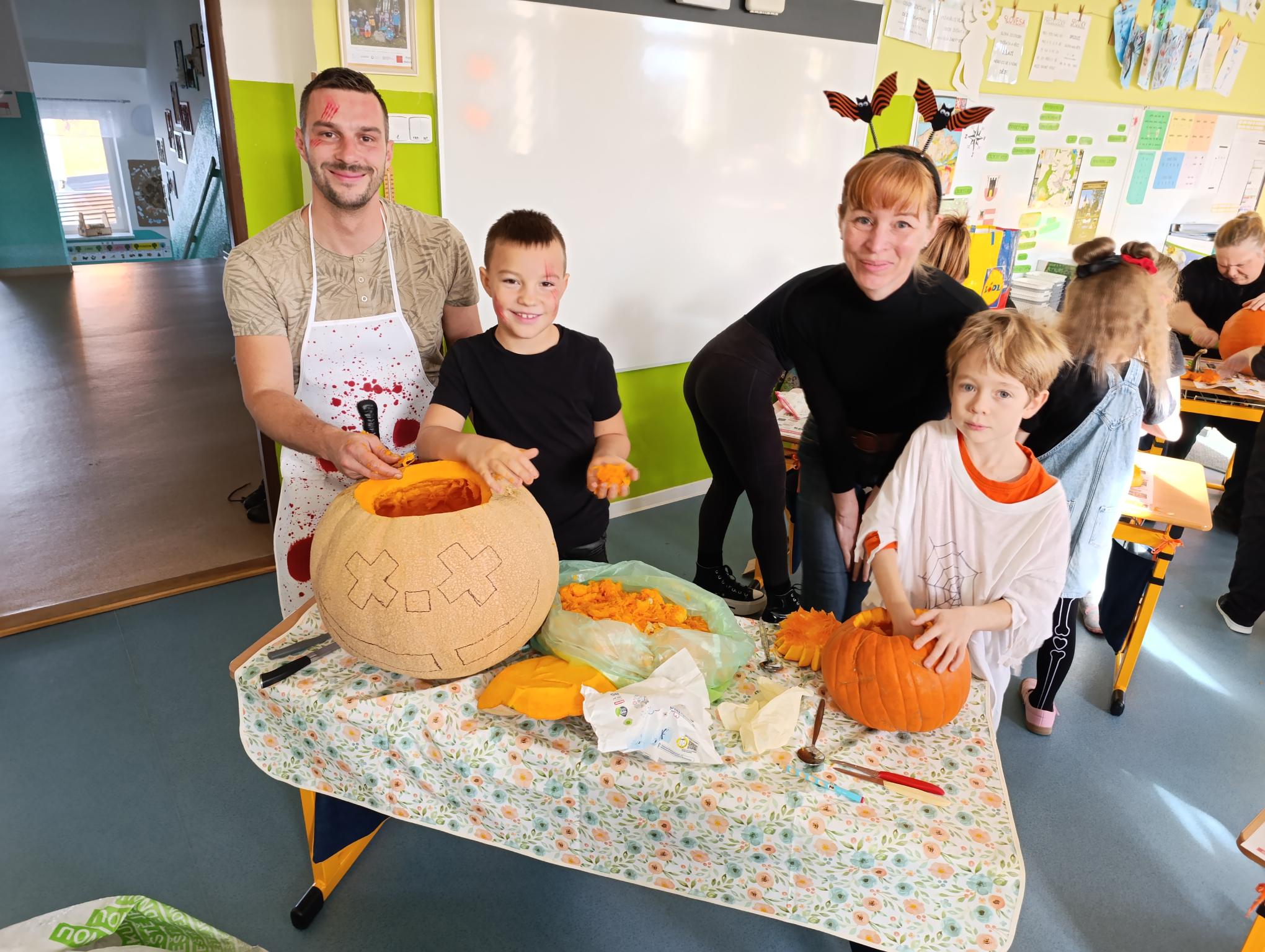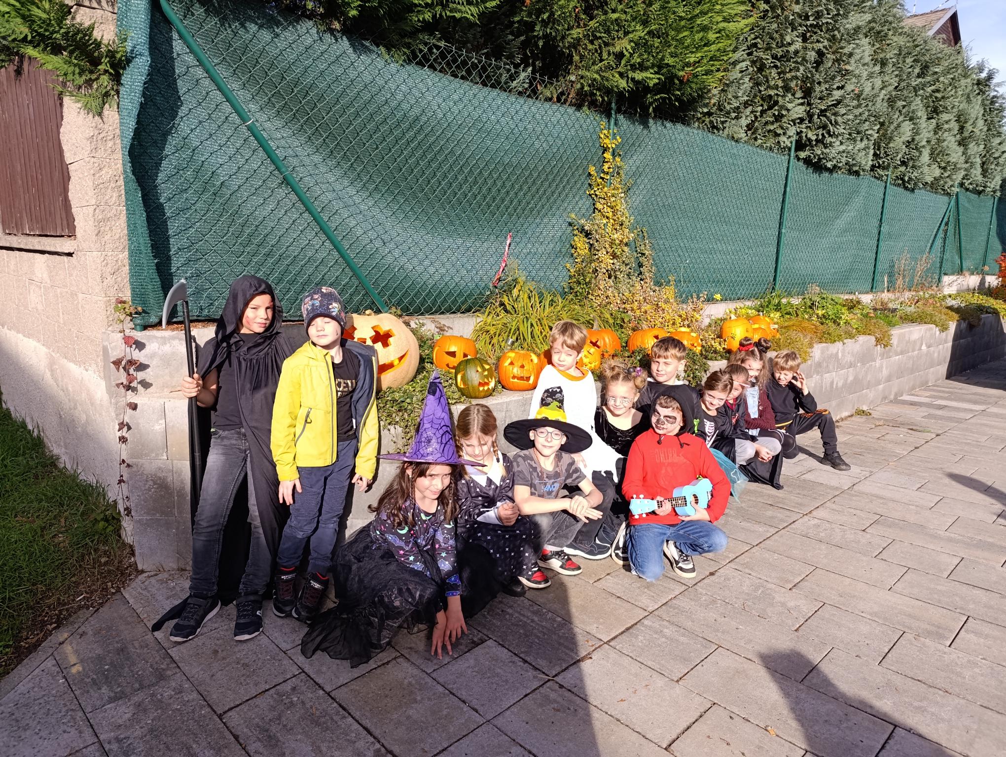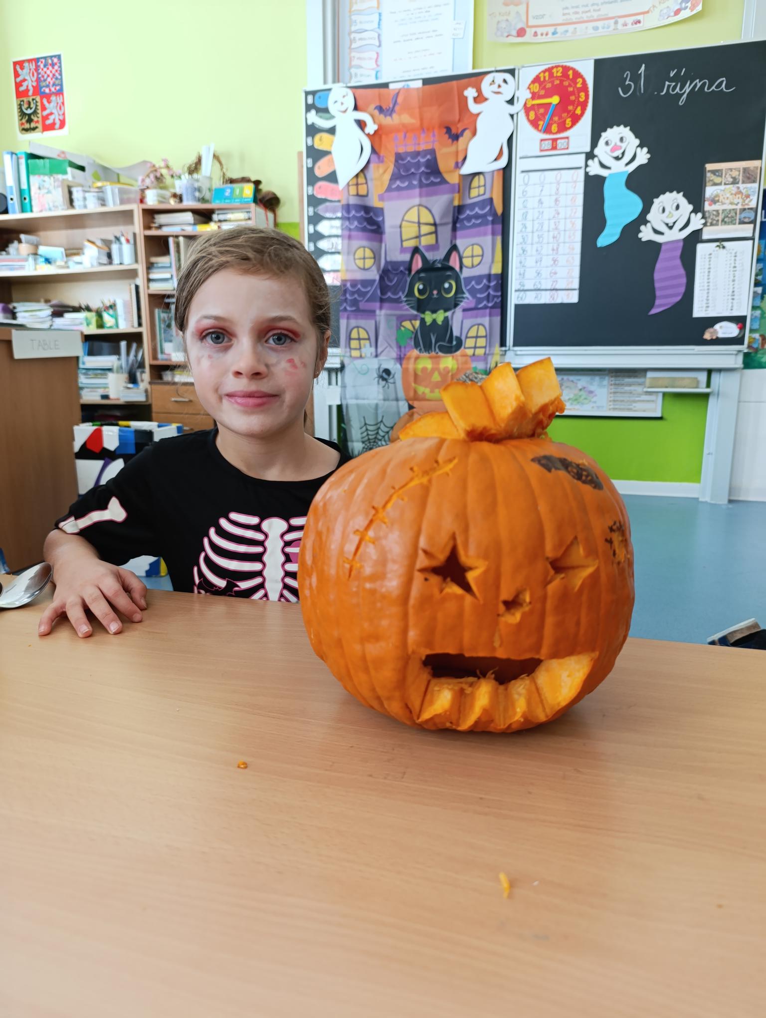Tematický den DUCHAŘENÍ jsme zahájili rytmickou show v sále KD. Zatančili jsme si, soutěžíli, motali mumie. Ve třídě jsme se potom s pomocí rodičů pustili do dlabání a vyrobili jsme dýňové lampy. Opět se nám moc povedly. Po práci odměna - užili jsme si malou hostinu: muffiny, halloweenské cukroví a pizzy, jablečné trhance a jablíčka z naší zahrady. Děkujeme maminkám!!! Pak jsme si dokončili malé papírové lampičky, do kterých jsme si schovali drobné sladkosti, opět dárek jedné z maminek. Abychom se dozvěděli historii svátku Halloween, připravili jsme si zašifrovaný text a hledali jsme odpovědi na otázky. Pomocí počítání jsme vyluštili jména rodiny Bubáčkových. Nakonec jsme si připomněli český svátek Dušičky