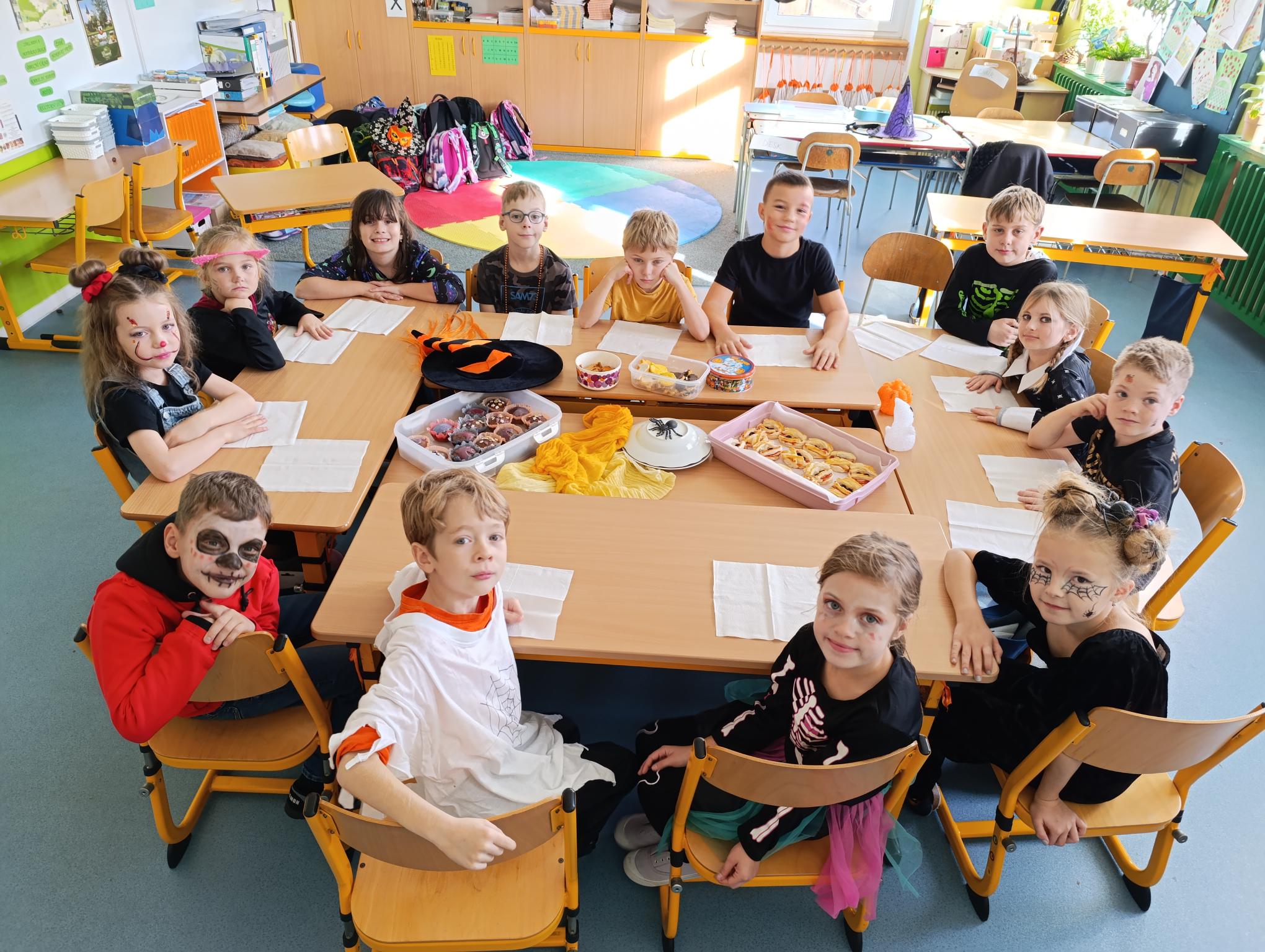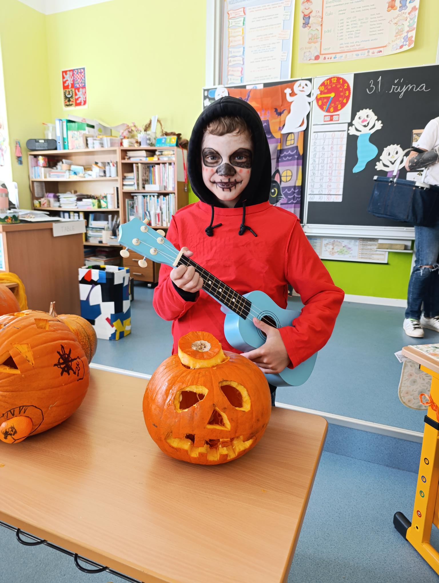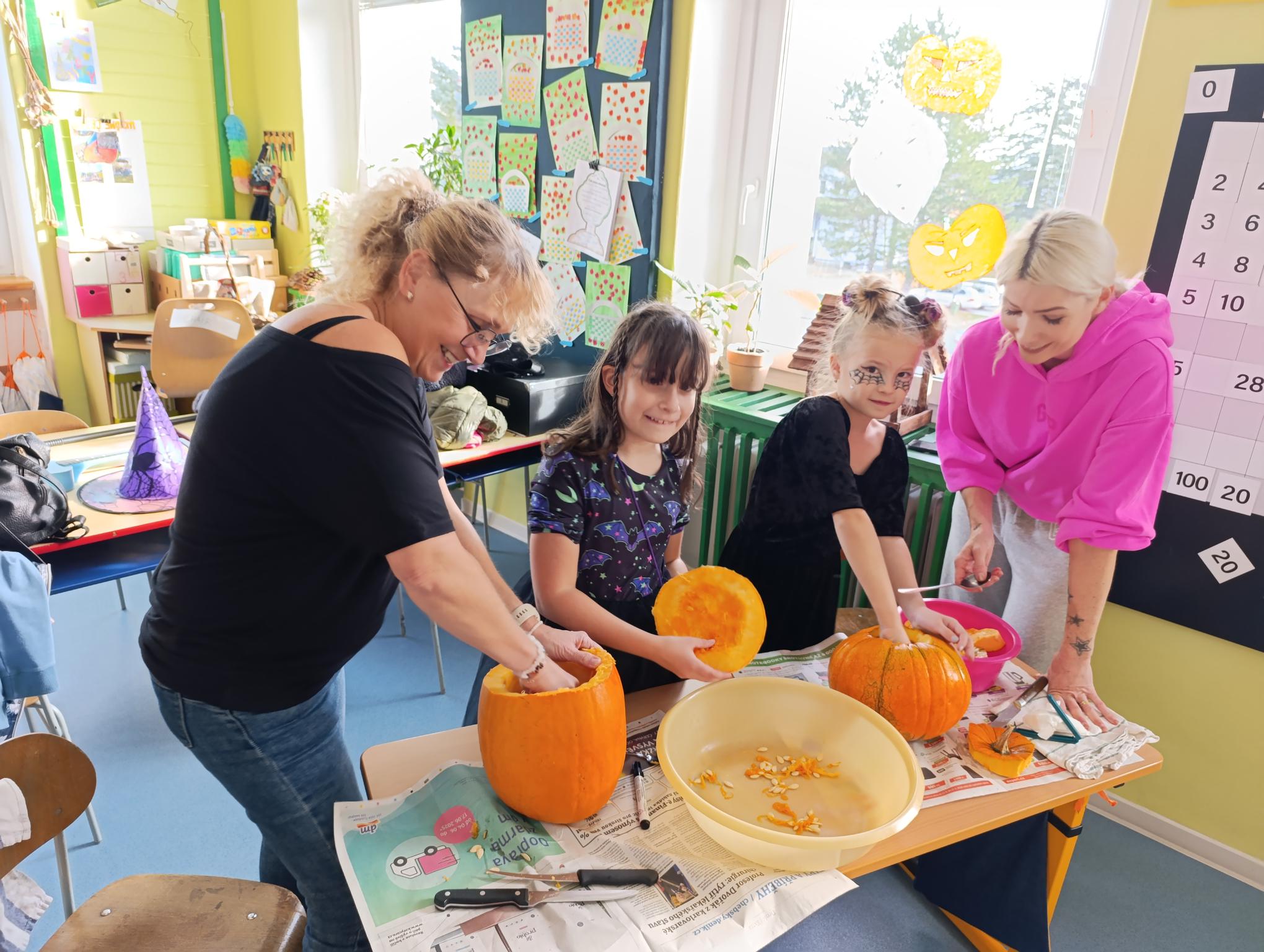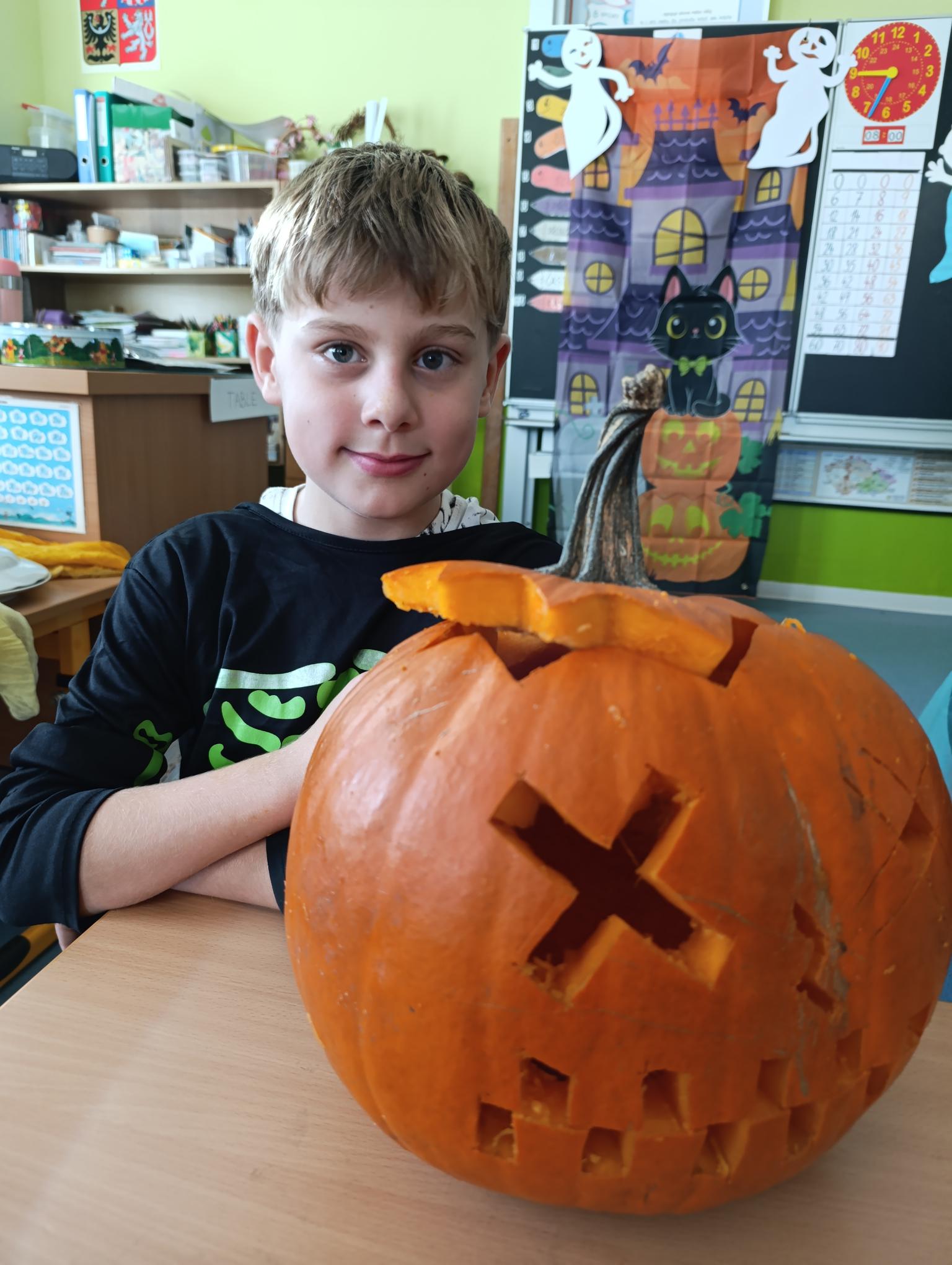 Tematický den DUCHAŘENÍ jsme zahájili rytmickou show v sále KD. Zatančili jsme si, soutěžíli, motali mumie. Ve třídě jsme se potom s pomocí rodičů pustili do dlabání a vyrobili jsme dýňové lampy. Opět se nám moc povedly. Po práci odměna - užili jsme si malou hostinu: muffiny, halloweenské cukroví a pizzy, jablečné trhance a jablíčka z naší zahrady. Děkujeme maminkám!!! Pak jsme si dokončili malé papírové lampičky, do kterých jsme si schovali drobné sladkosti, opět dárek jedné z maminek. Abychom se dozvěděli historii svátku Halloween, připravili jsme si zašifrovaný text a hledali jsme odpovědi na otázky. Pomocí počítání jsme vyluštili jména rodiny Bubáčkových. Nakonec jsme si připomněli český svátek Dušičky