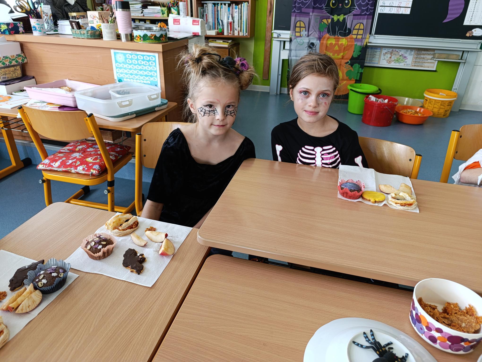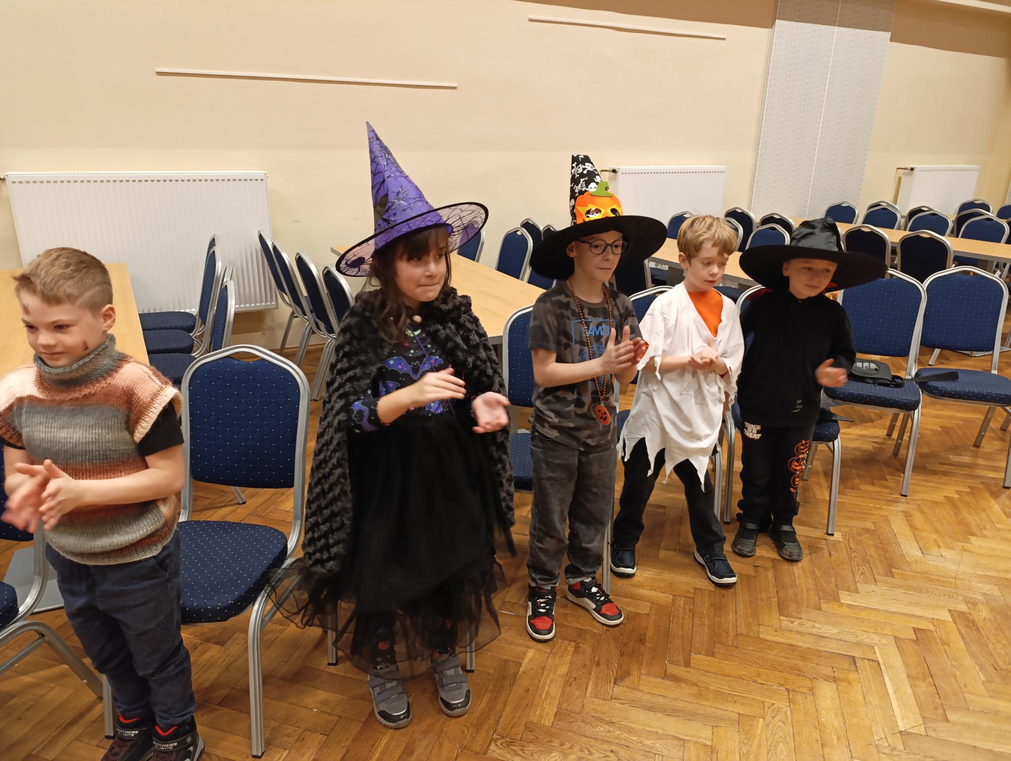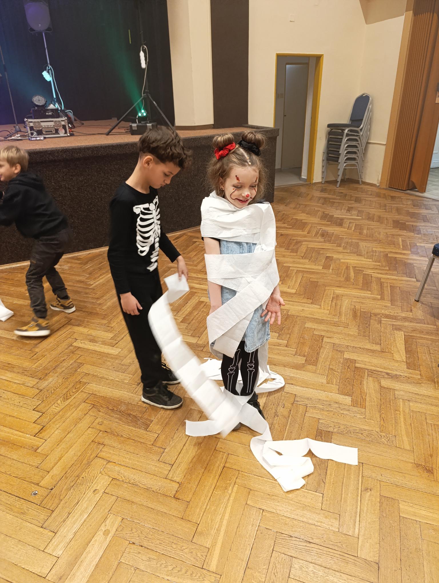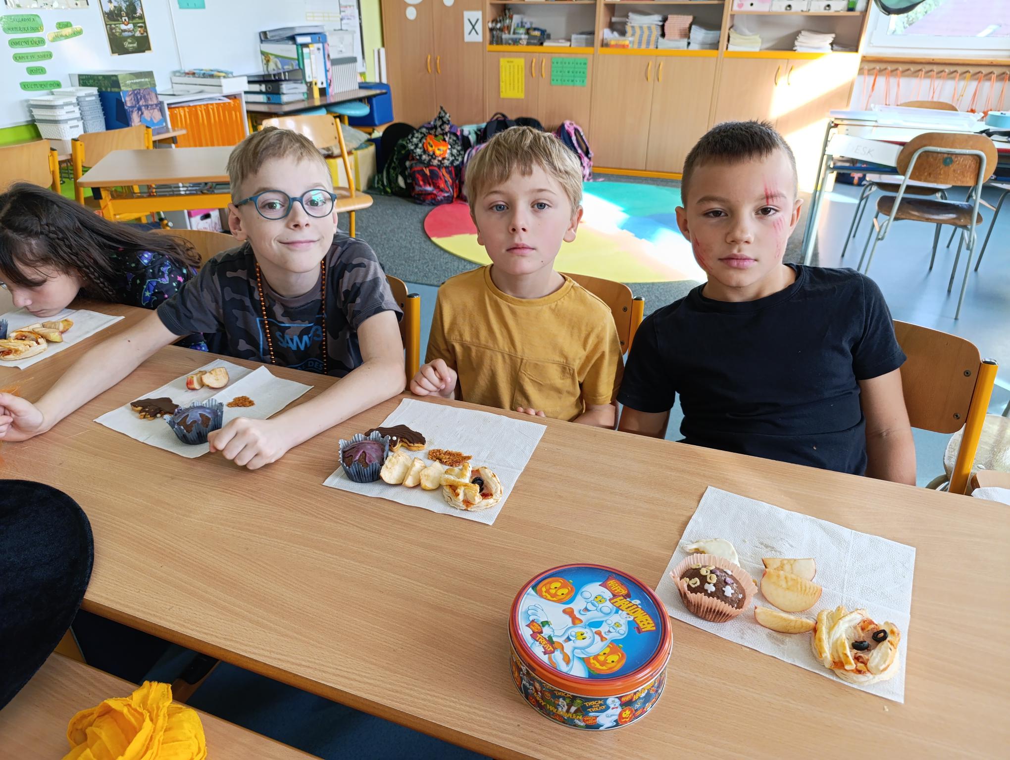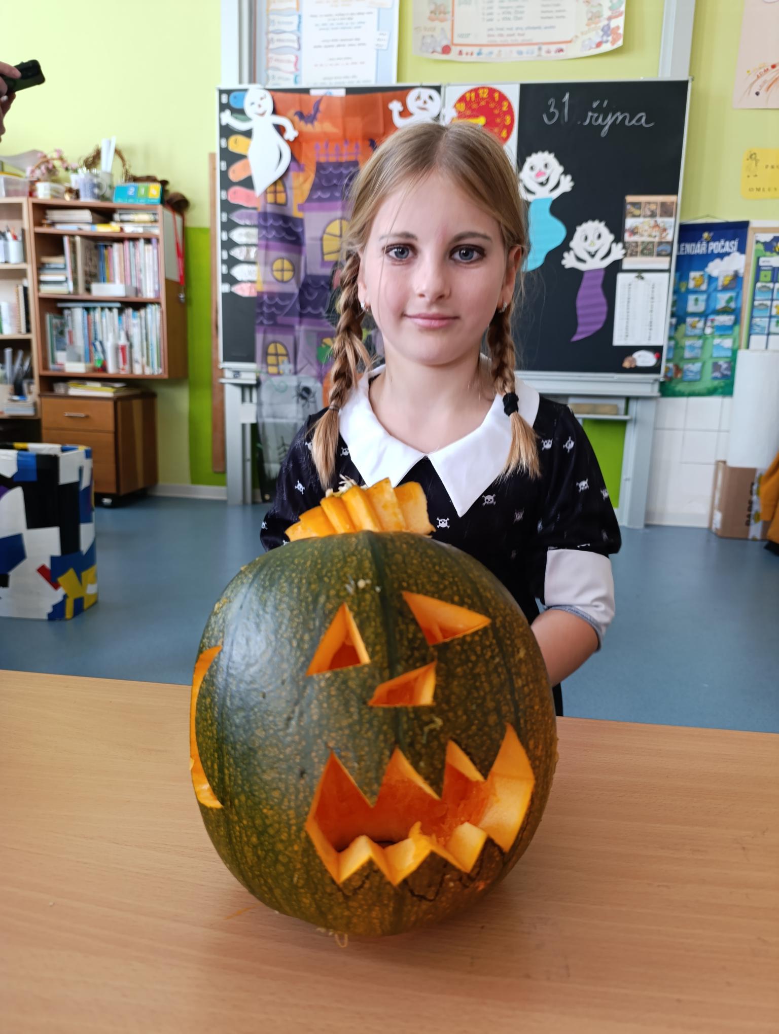 Tematický den DUCHAŘENÍ jsme zahájili rytmickou show v sále KD. Zatančili jsme si, soutěžíli, motali mumie. Ve třídě jsme se potom s pomocí rodičů pustili do dlabání a vyrobili jsme dýňové lampy. Opět se nám moc povedly. Po práci odměna - užili jsme si malou hostinu: muffiny, halloweenské cukroví a pizzy, jablečné trhance a jablíčka z naší zahrady. Děkujeme maminkám!!! Pak jsme si dokončili malé papírové lampičky, do kterých jsme si schovali drobné sladkosti, opět dárek jedné z maminek. Abychom se dozvěděli historii svátku Halloween, připravili jsme si zašifrovaný text a hledali jsme odpovědi na otázky. Pomocí počítání jsme vyluštili jména rodiny Bubáčkových. Nakonec jsme si připomněli český svátek Dušičky