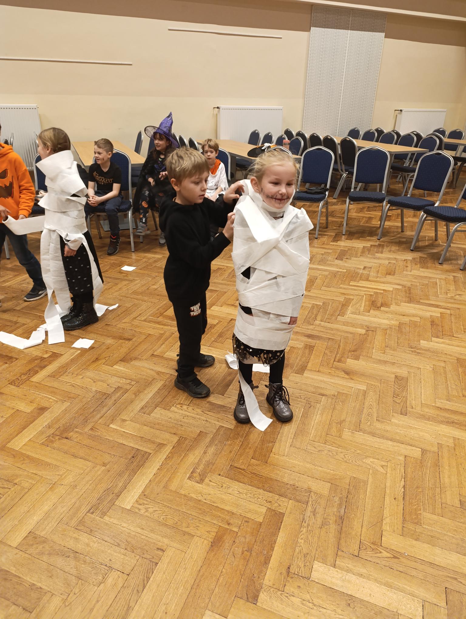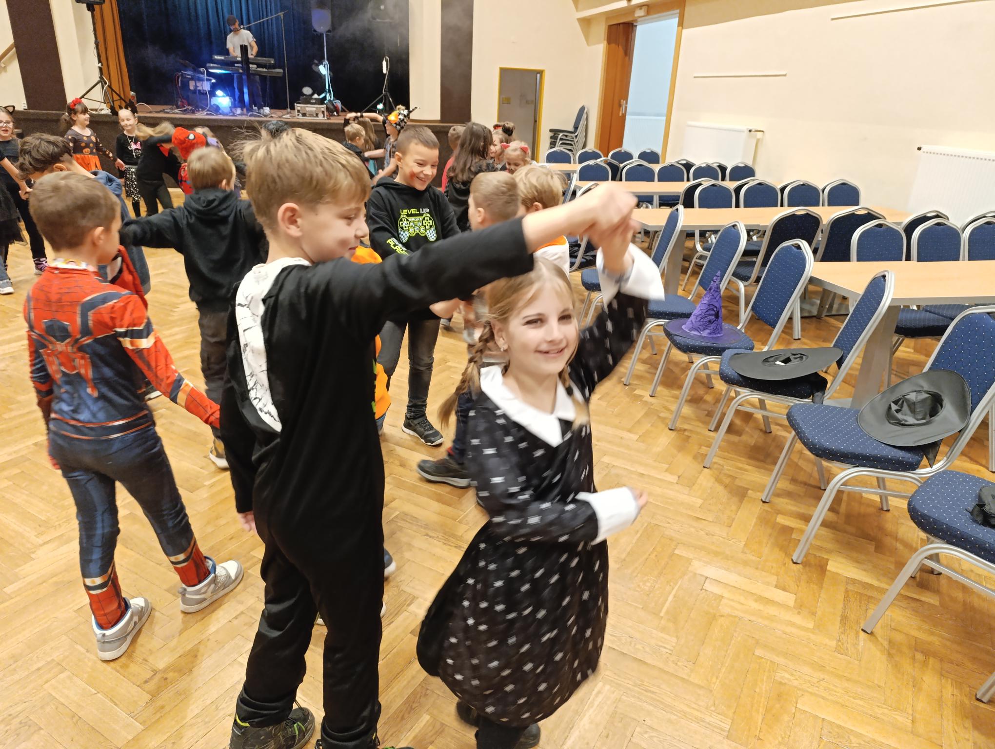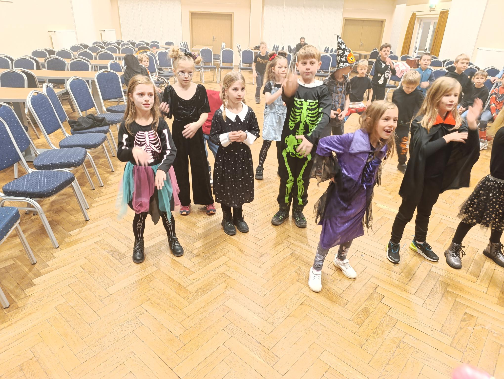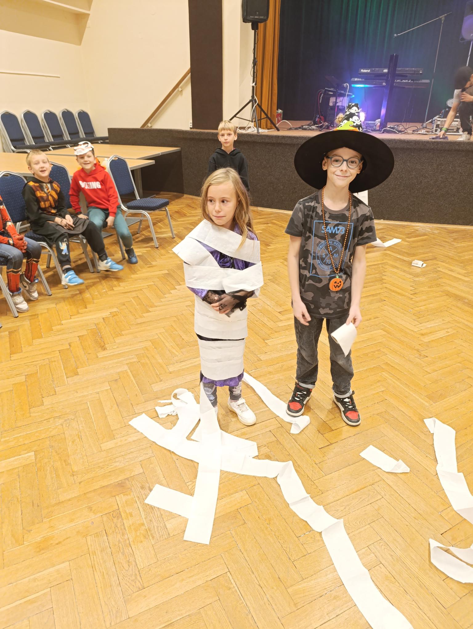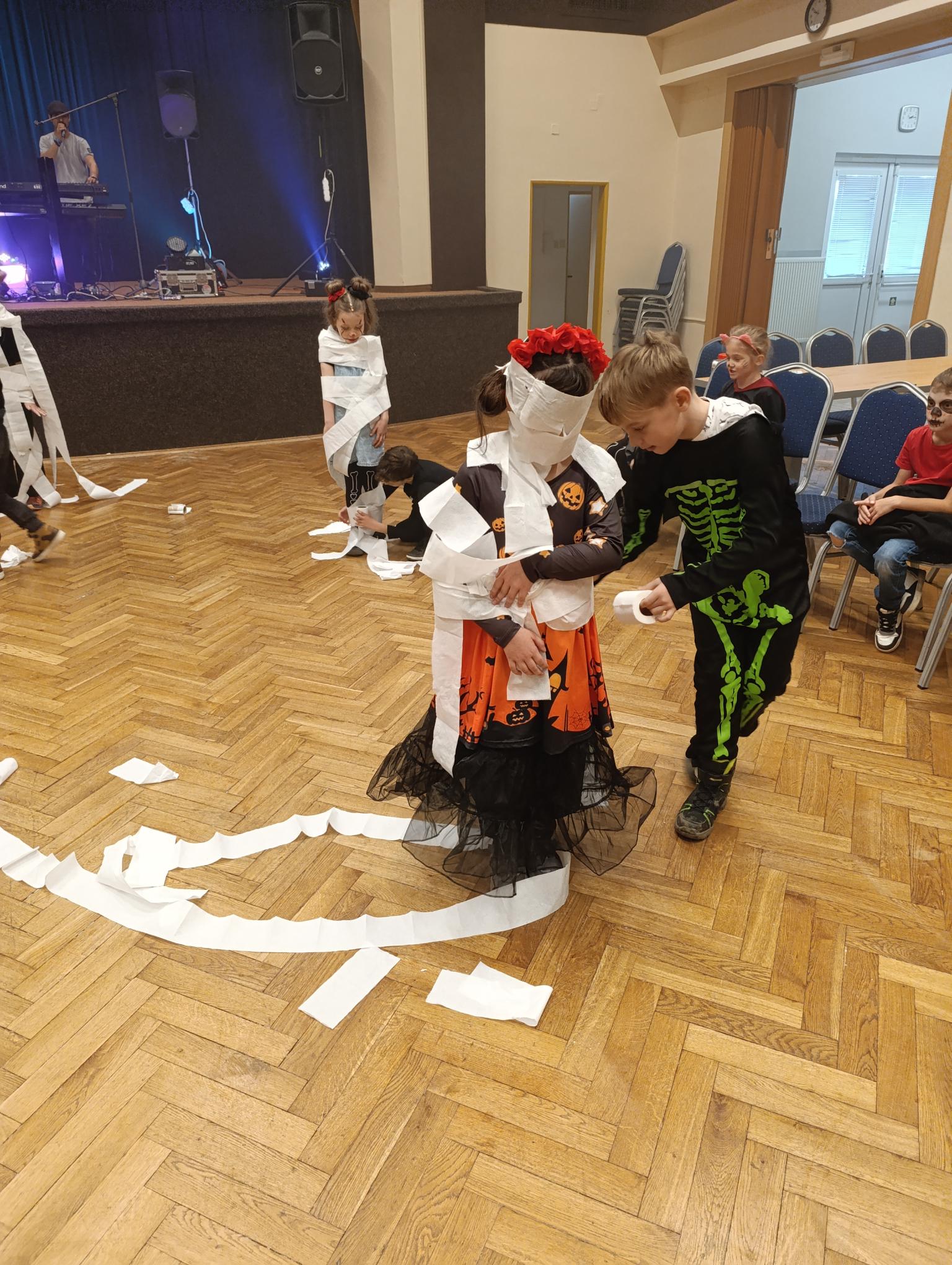 Tematický den DUCHAŘENÍ jsme zahájili rytmickou show v sále KD. Zatančili jsme si, soutěžíli, motali mumie. Ve třídě jsme se potom s pomocí rodičů pustili do dlabání a vyrobili jsme dýňové lampy. Opět se nám moc povedly. Po práci odměna - užili jsme si malou hostinu: muffiny, halloweenské cukroví a pizzy, jablečné trhance a jablíčka z naší zahrady. Děkujeme maminkám!!! Pak jsme si dokončili malé papírové lampičky, do kterých jsme si schovali drobné sladkosti, opět dárek jedné z maminek. Abychom se dozvěděli historii svátku Halloween, připravili jsme si zašifrovaný text a hledali jsme odpovědi na otázky. Pomocí počítání jsme vyluštili jména rodiny Bubáčkových. Nakonec jsme si připomněli český svátek Dušičky