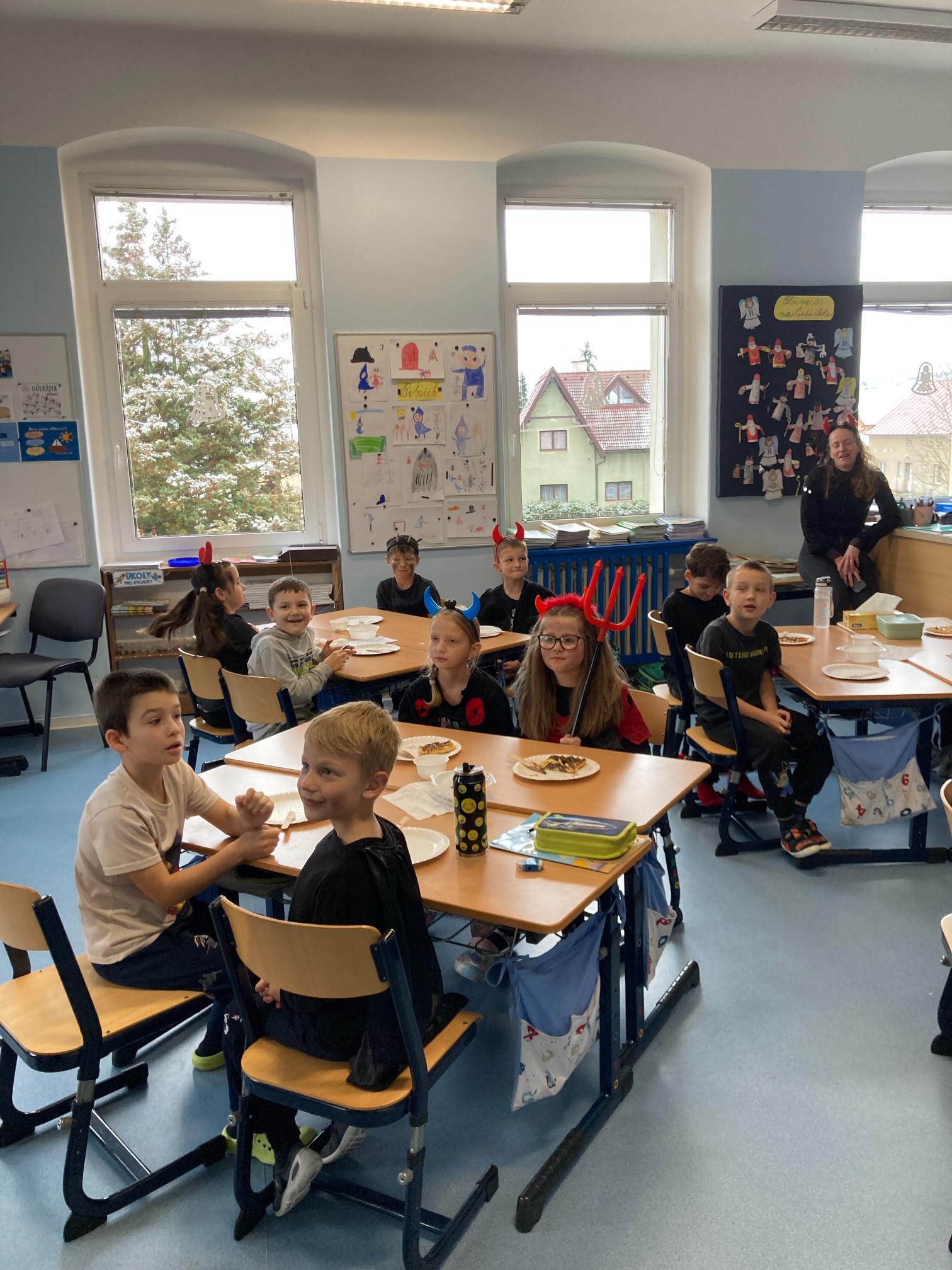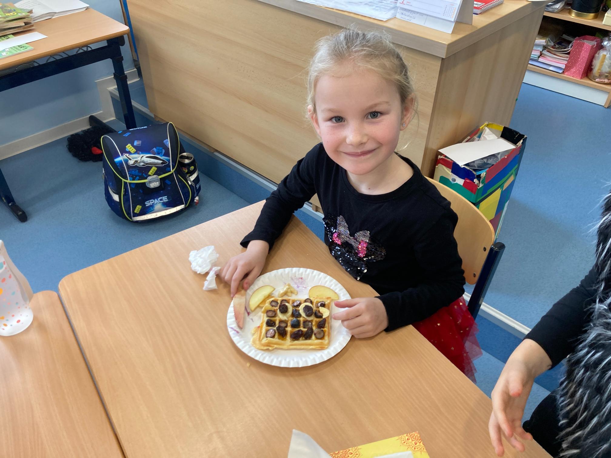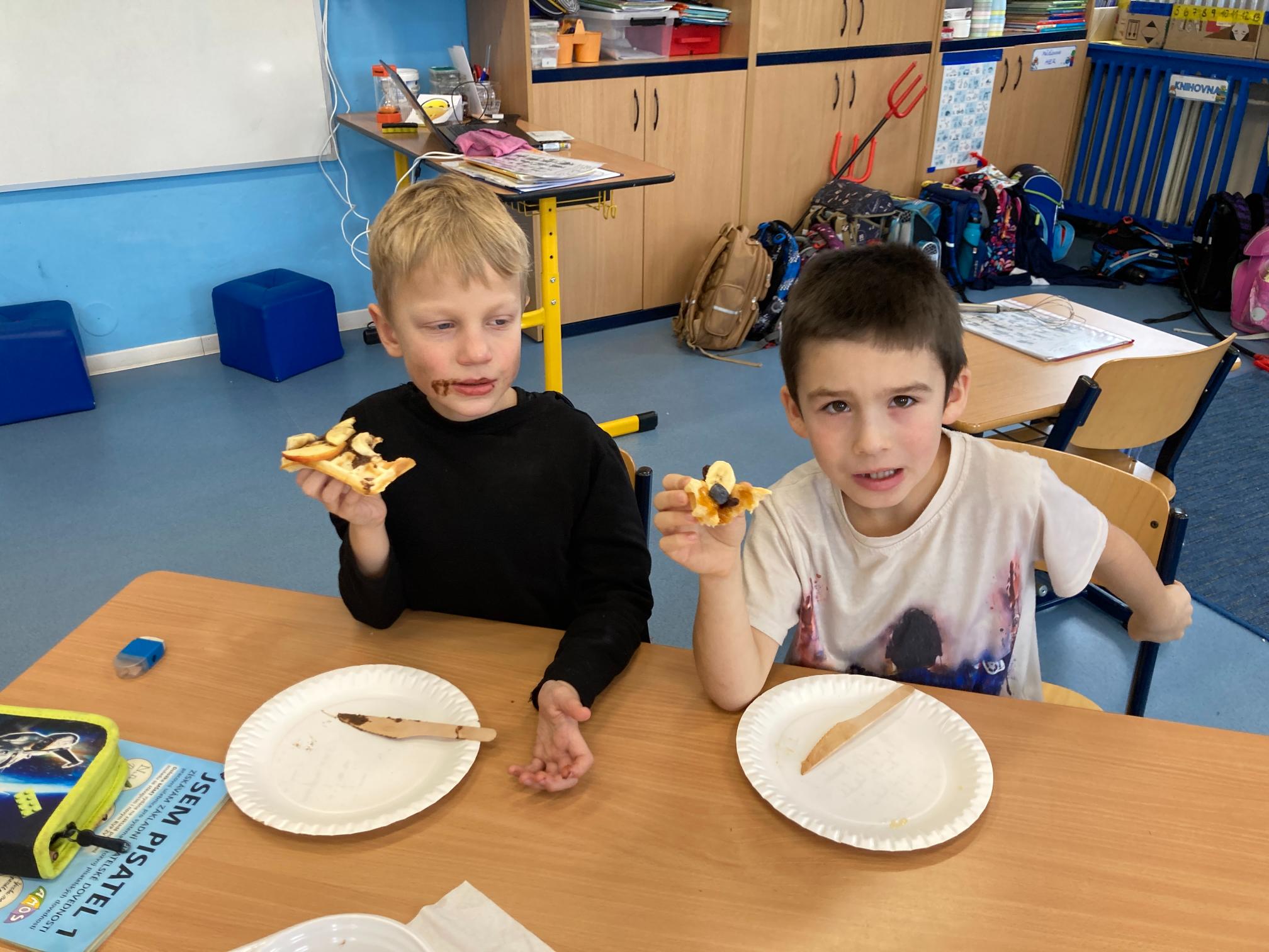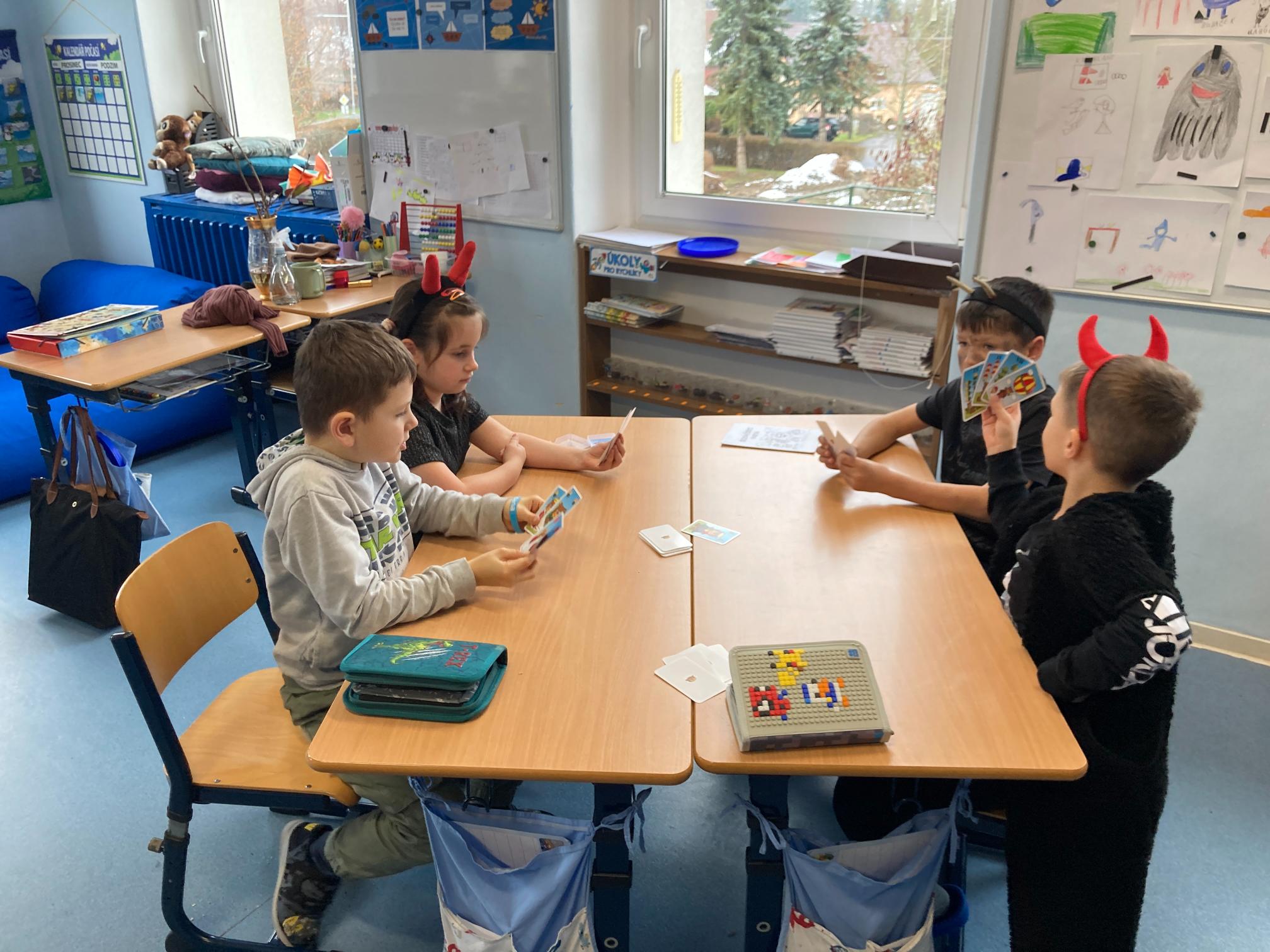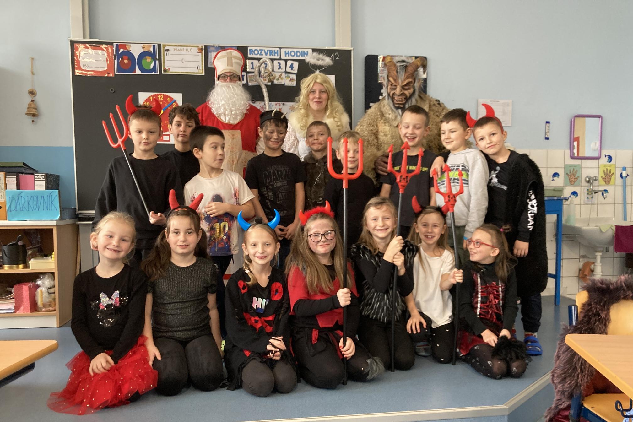 Dne 5. 12. jsme ve škole plnili čertí úkoly a také jsme měli čertí svačinu. Výborné vafle, které pro nás připravila maminka spolužáka, jsme si nazdobili ovocem jako čertíka. Mikuláš s andělem a čertem nám přinesli nadílku. Nechyběla ani čertovská zábava - hraní karet.