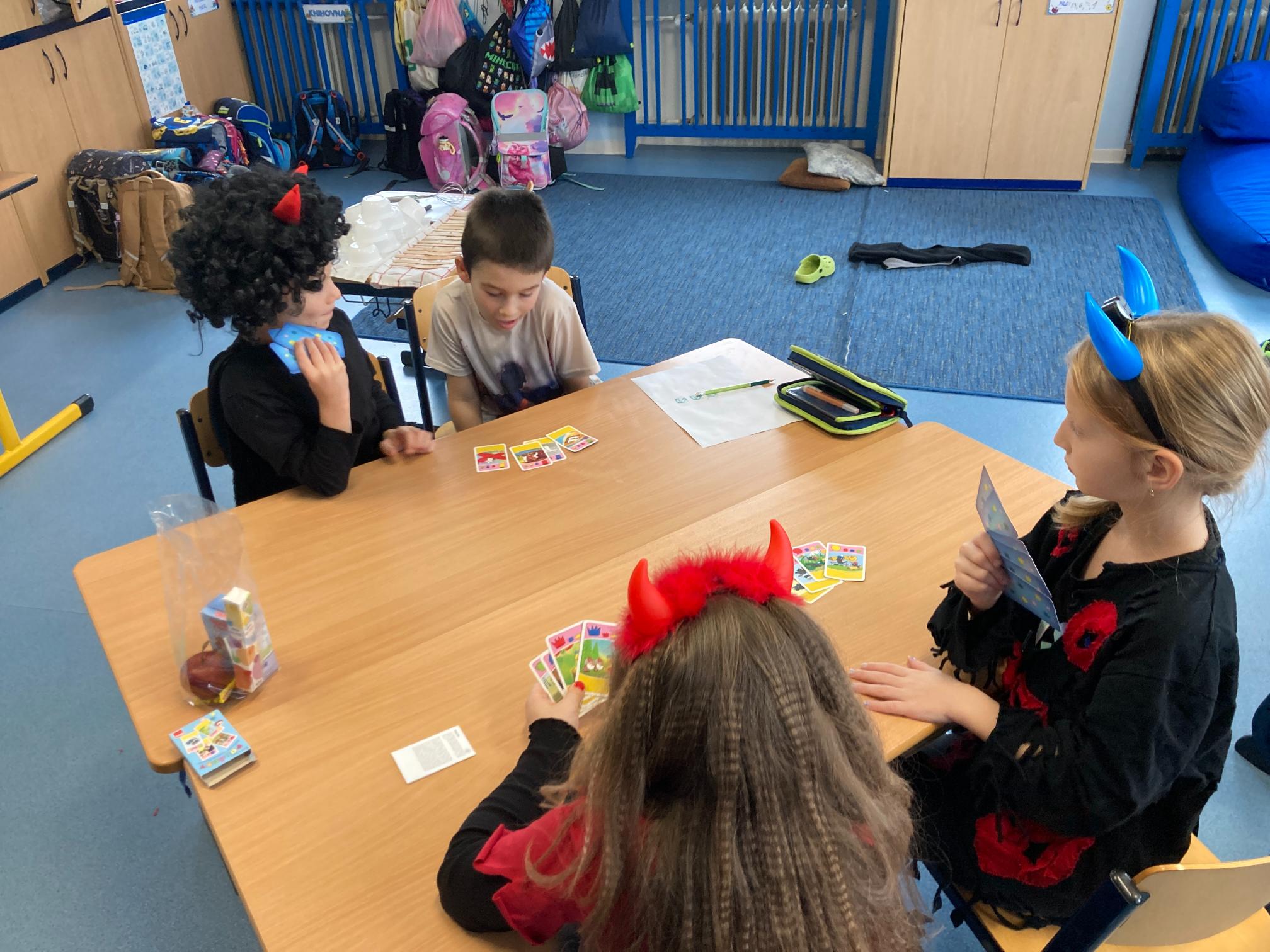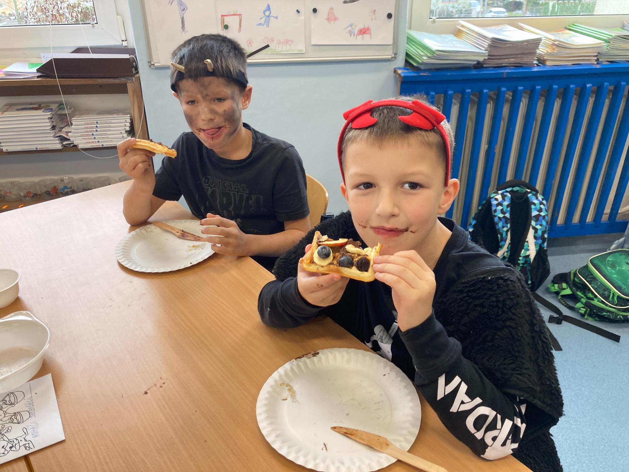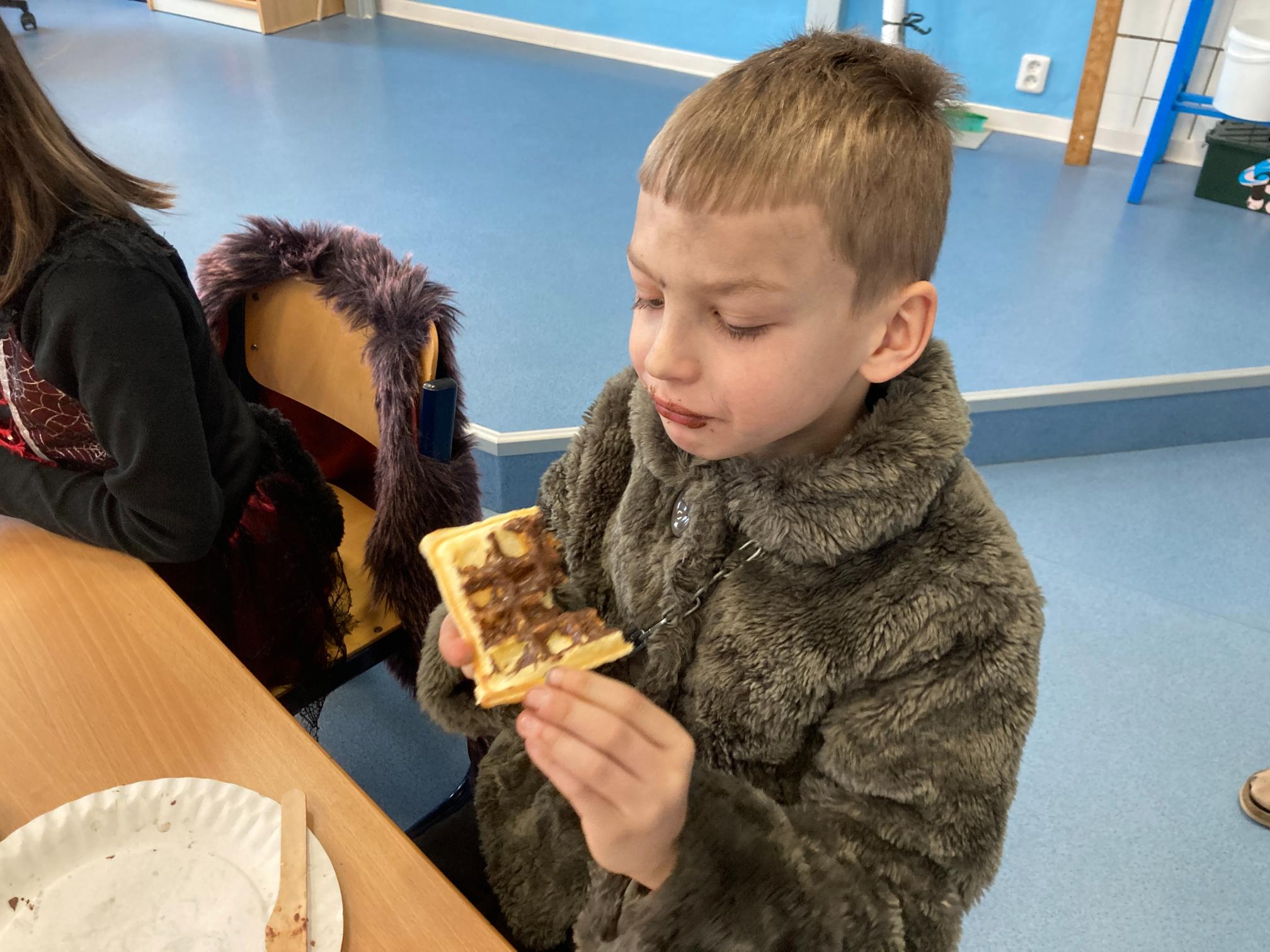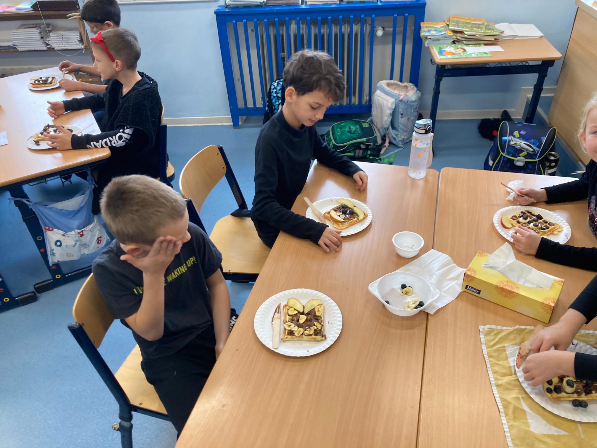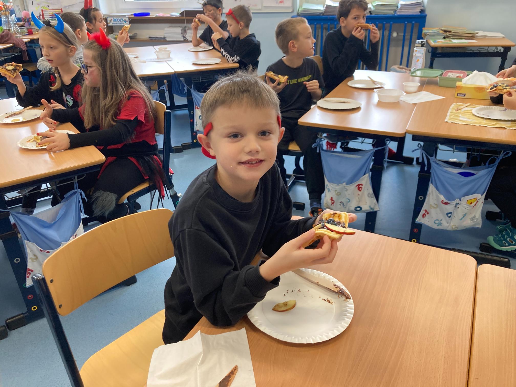 Dne 5. 12. jsme ve škole plnili čertí úkoly a také jsme měli čertí svačinu. Výborné vafle, které pro nás připravila maminka spolužáka, jsme si nazdobili ovocem jako čertíka. Mikuláš s andělem a čertem nám přinesli nadílku. Nechyběla ani čertovská zábava - hraní karet.