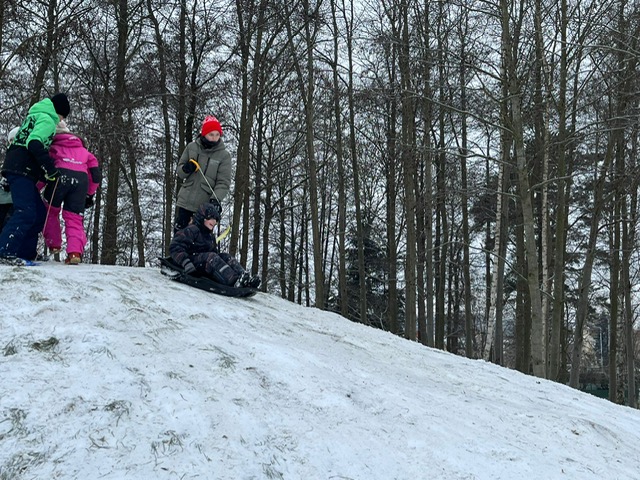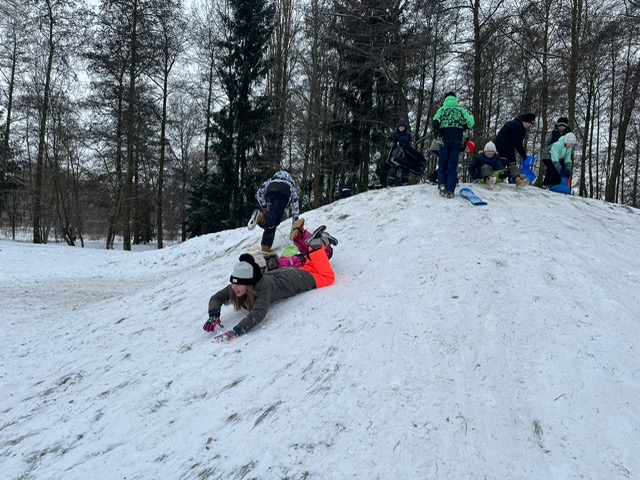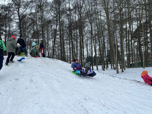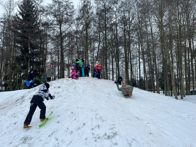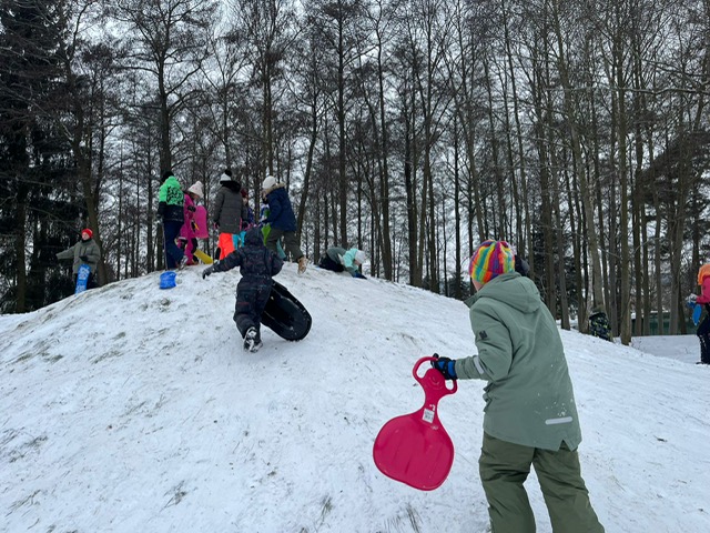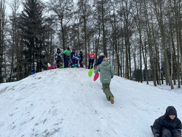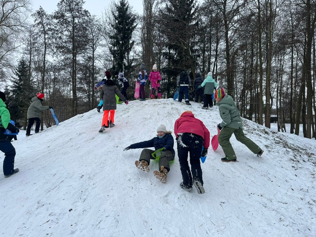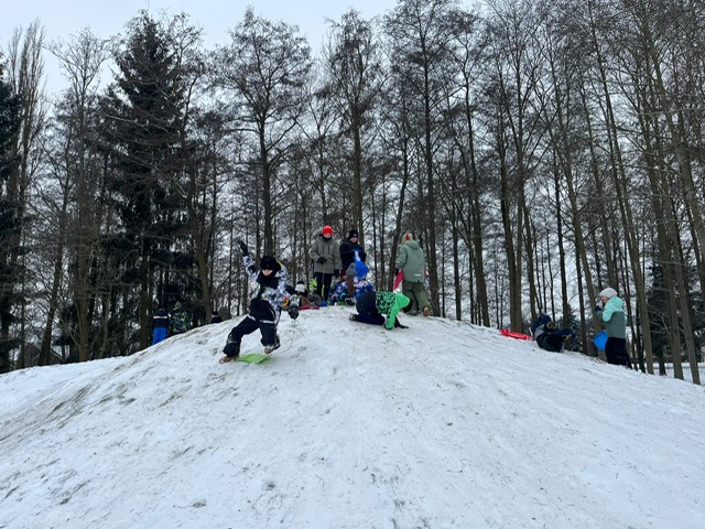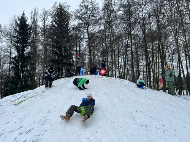 Dnešní hodina TV proběhla na nedalekém kopci. Děti si hrátky na sněhu moc užily.